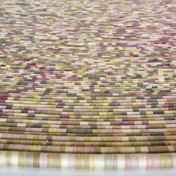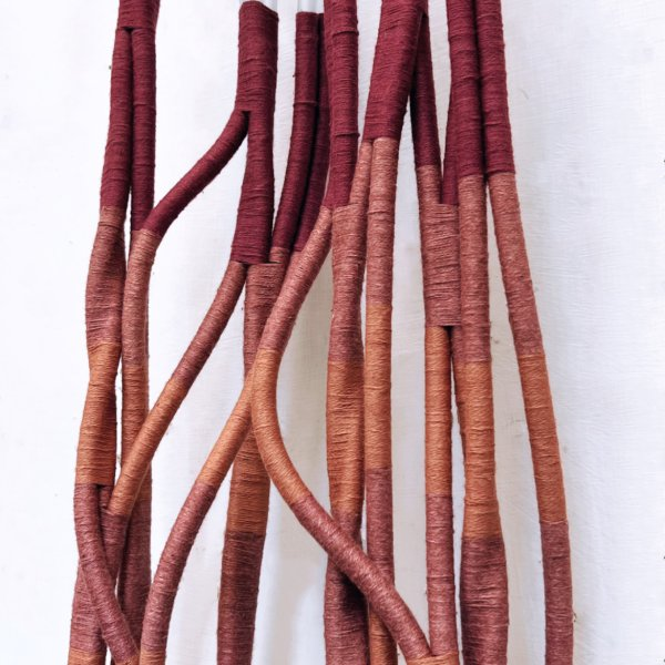 Weinberg probes the connections between human life and ecological crises in her poignant textile works. For the past eight years, Weinberg has incorporated data, organic fibers colored with plant- and insect-derived dyes, and plastic materials such as fishing line and medical tubes into landscape-based weavings showing the effects of climate change. In a recent work, Memories of Future Fires, she depicts the silhouette of a charred tree, evoking the human heart and lungs. In Silt Studies, a 2021 series of 18 woven tapestries, she uses temperature data from major American waterways to show incremental climate increases that threaten the natural world. Prior to her work with climate data, Weinberg used data around other social justice issues, such as gendered violence and housing insecurity, to make her textiles.