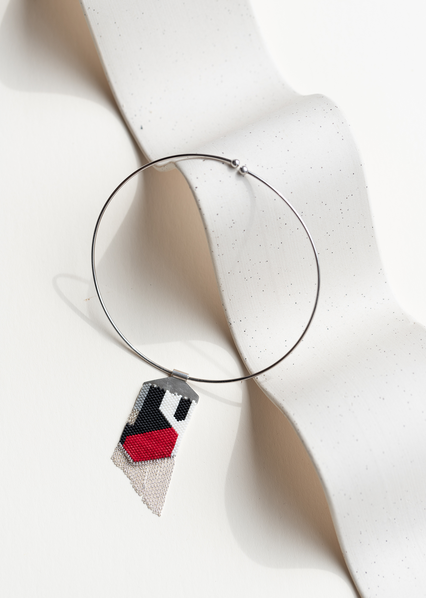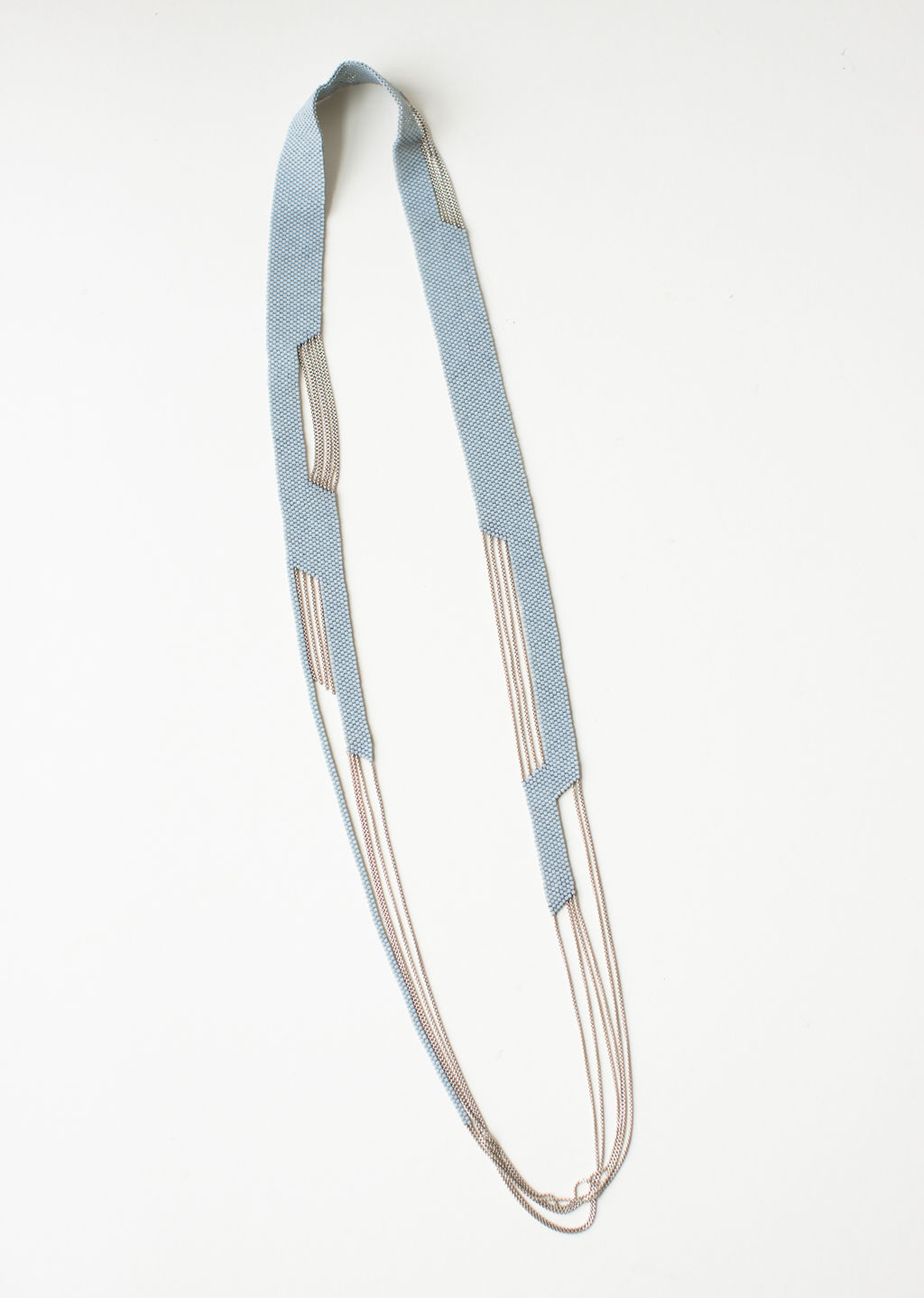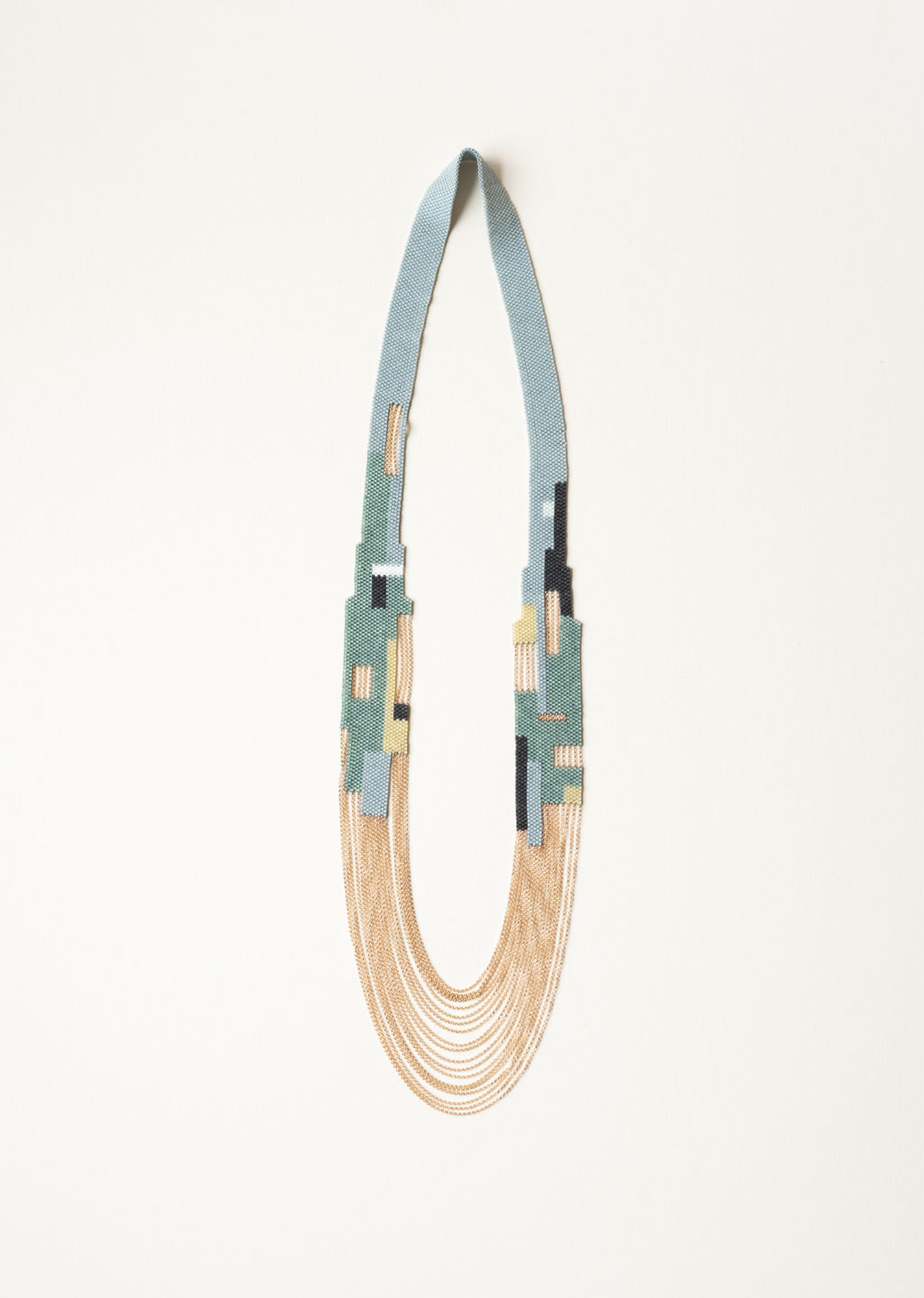Yang’s well of inspiration spans the globe: architecture, the natural environment in her adopted hometown of Portland, the seed-bead sculptures and jewelry of Baltimore artist Joyce J. Scott, ethnic costumes in Southeast Asia, beadwork from Africa and the Indigenous cultures of the Americas, and Western high-couture jewelry have all sparked ideas for designs and color schemes. Yang similarly sources the materials for her work from all over: chains and metals come from Rio Grande Jewelry Supply, she orders glass beads from Caravan Beads in Maine, and she finds one-off “interesting little things” on Etsy and at gem shows.