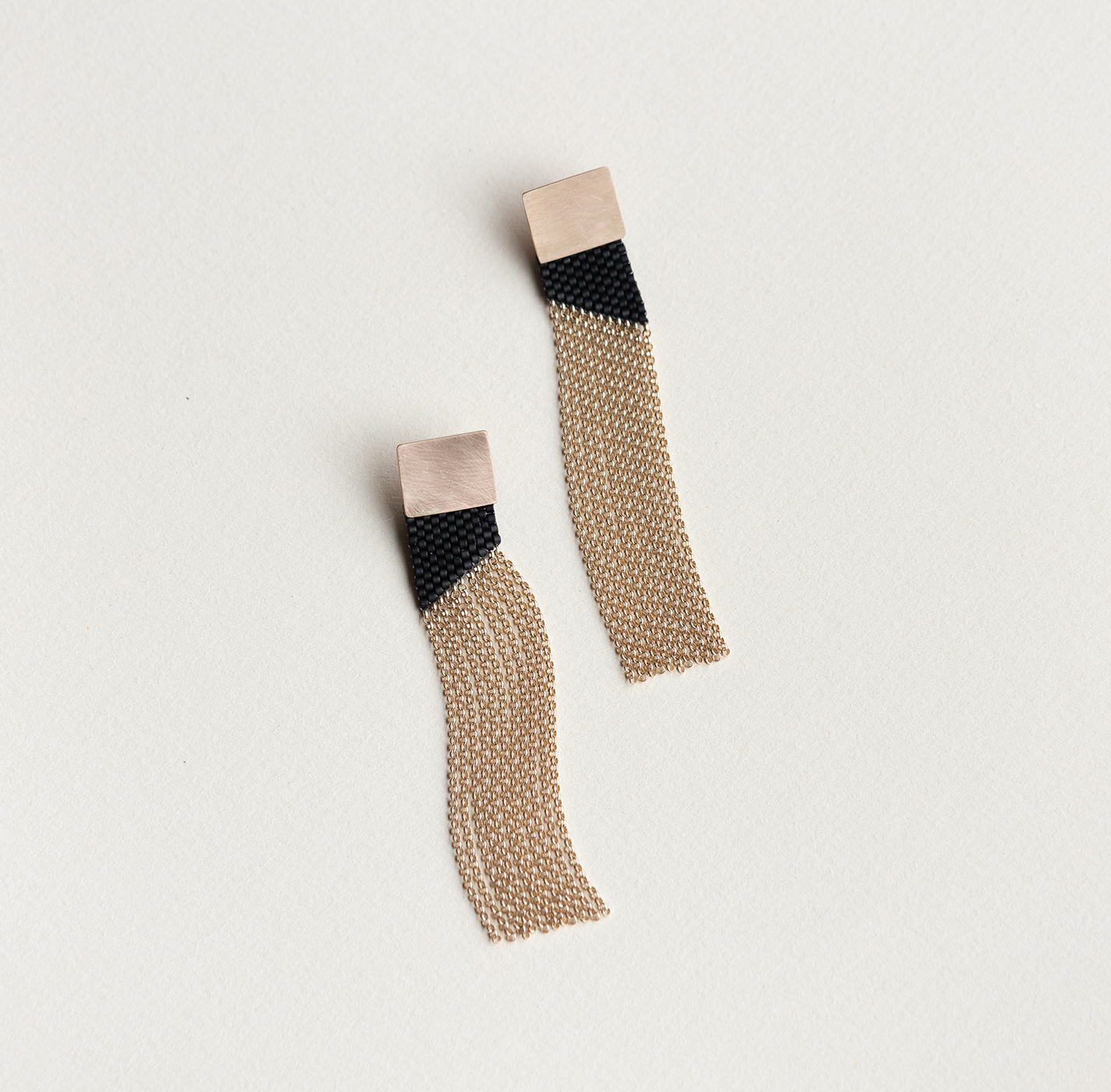 So she did. In 2019, Yang was playing around with materials when she hit upon the idea of using beadwork in her jewelry. It was a logical fit. “After the metal jewelry, I thought maybe I should use a material that’s more friendly,” she says. “With beading, you use a thread and needle, which I’m so familiar with as a clothing designer,” she says. In necklaces such as Serendipity, Eternity, and Layer, cascading sheets of tiny beads are combined with dainty chains in silver, gold, and brass to create art deco–like compositions. Stitched together, the glass beads in Yang’s bracelets, necklaces, rings, and earrings take on significant heft. Placed beside the delicate chains, there’s an equilibrium to the work. “Chains have a lot of movement and fluidity, and beads can provide structure,” she says. “They complement each other.”