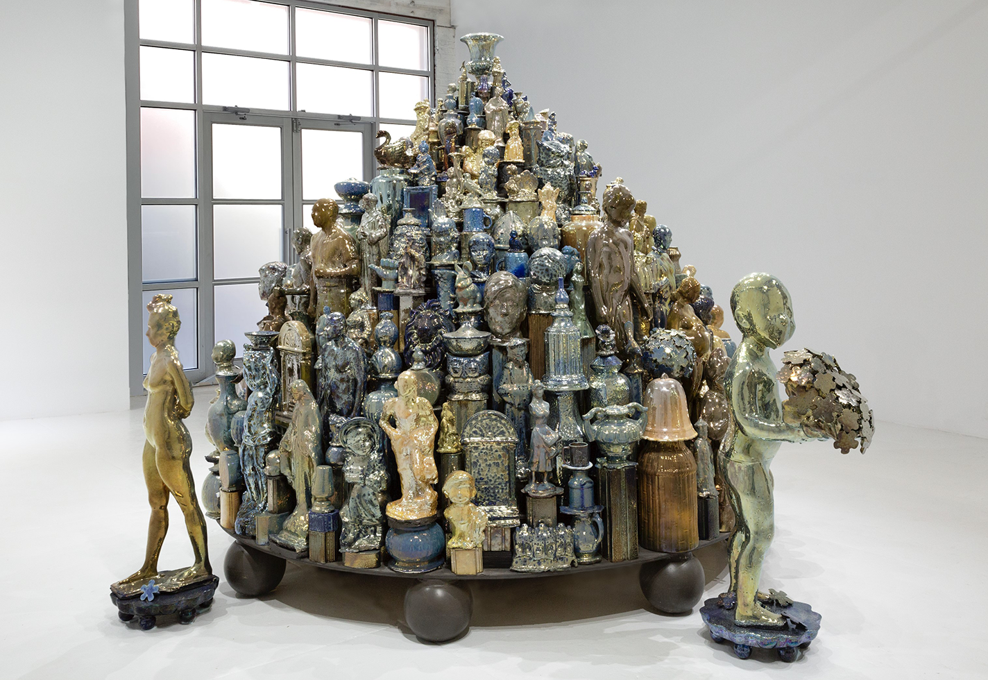 Aaron Smith holds a sculpture by Godeleine de Rosamel. Mark Todd with the same sculpture.