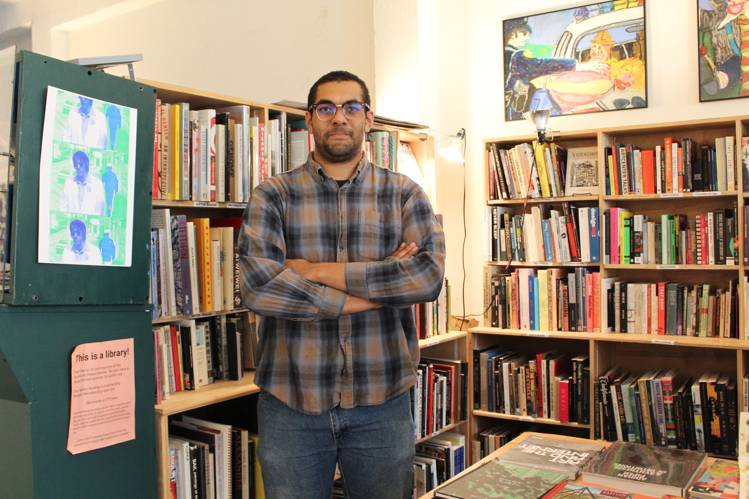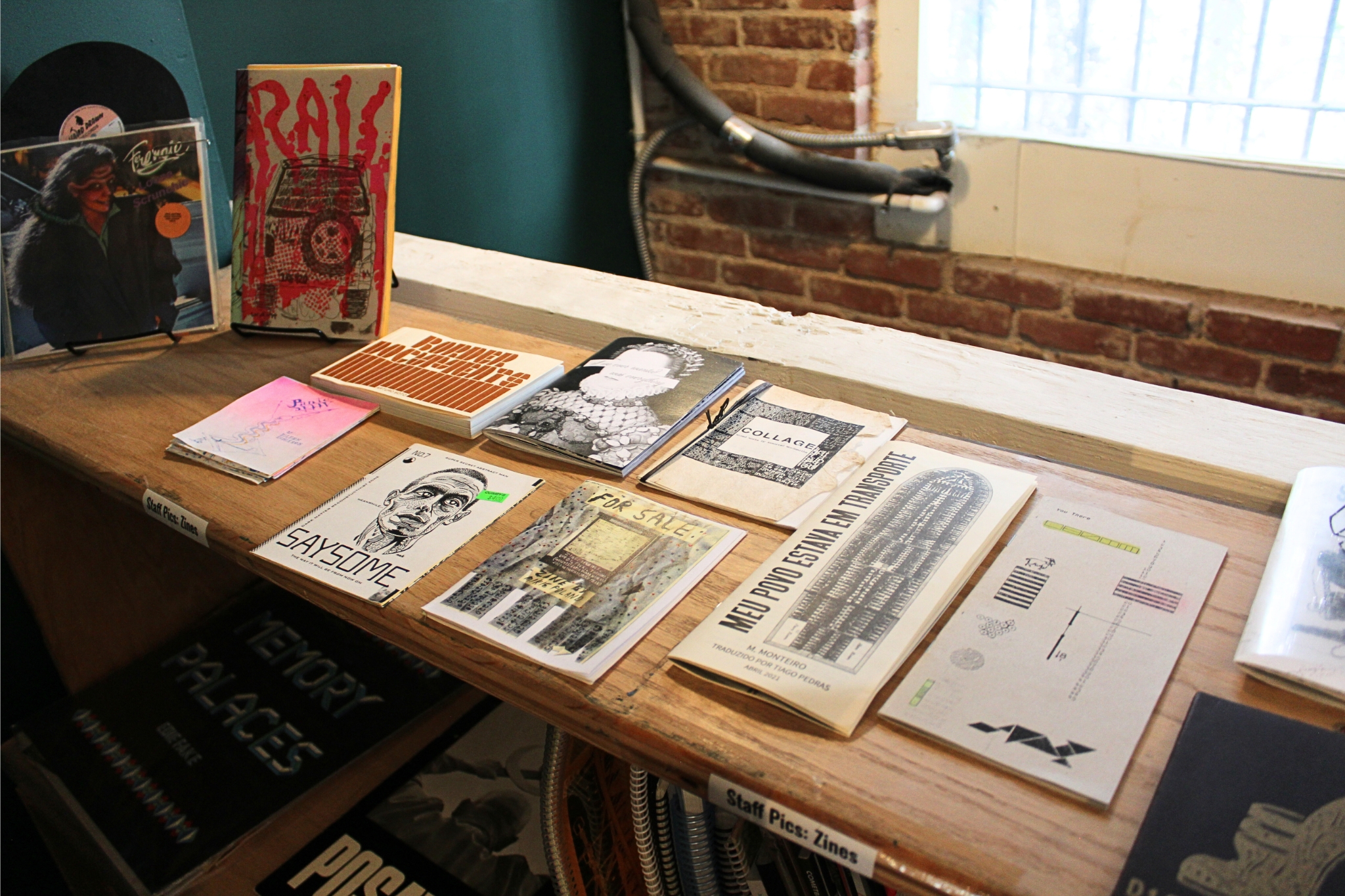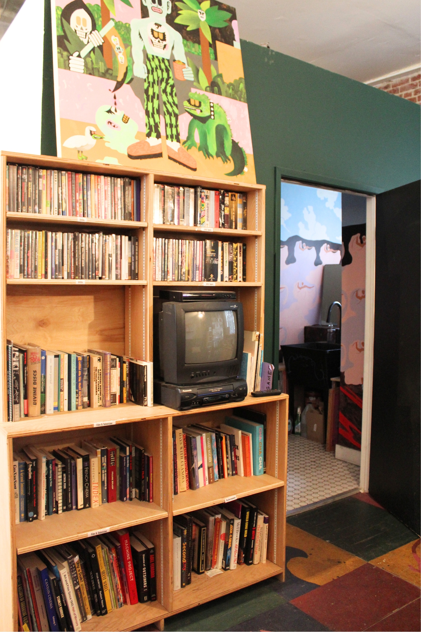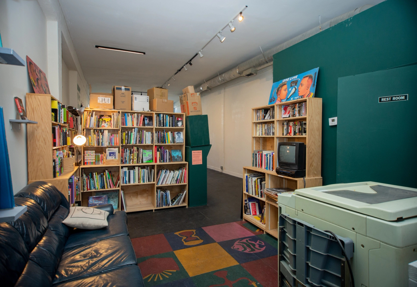 Near the entrance, a wooden platform holds a collection of used books and zines. To the left, a rotating selection of artwork runs along the wall, while farther back, shelves hold rare and out-of-print art books. In the rear corner, a TV–VCR combo rests next to a stack of classic skateboarding VHS tapes and a worn leather couch. It feels like a neighborhood skate shop where teenagers linger for hours and flip through magazines, free from the imperative to purchase anything.