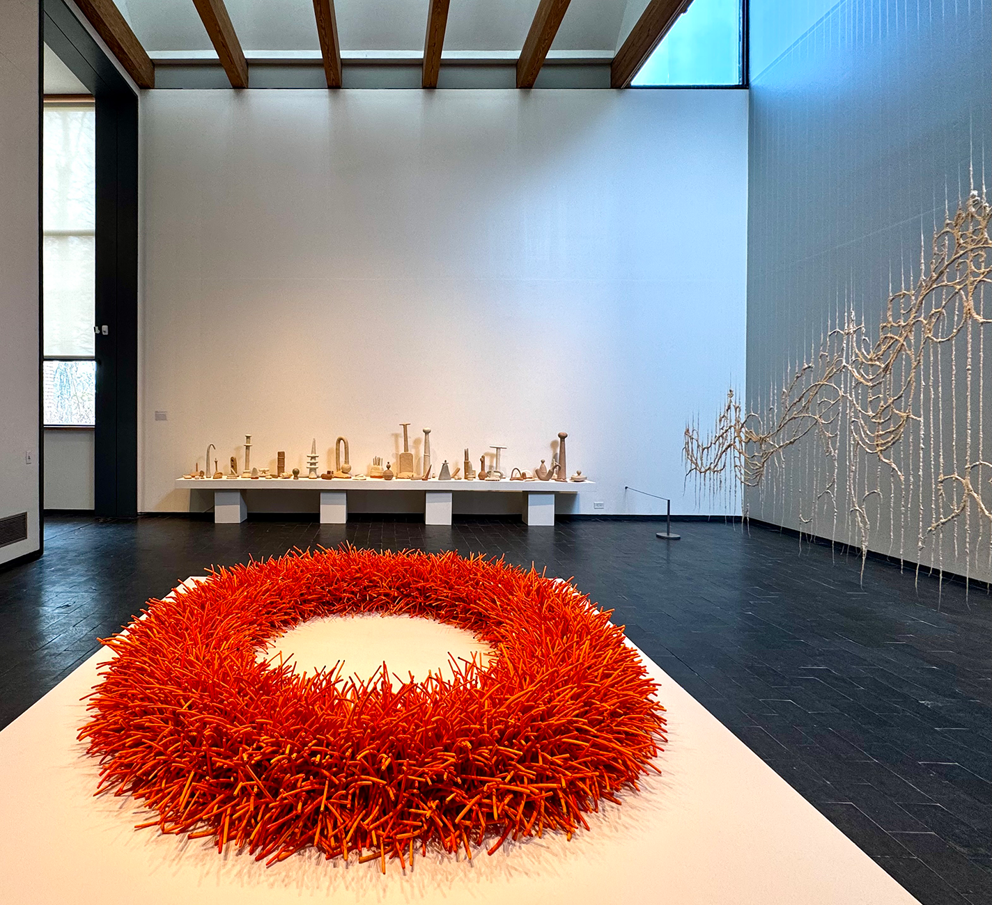 The exhibition includes Bean Finneran’s earthenware sculpture Orange Ring, which evokes repetition in the natural world. The seven-foot-wide piece sits on the floor at the center of the gallery. It recalls a bird’s nest—assembled on site, Finneran layered more than 10,000 small hand-rolled glazed clay spindles into a ring on the floor.