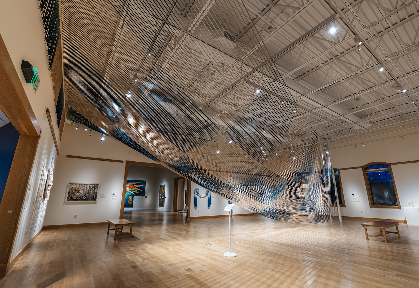 Entering the exhibition space, the eye is immediately drawn to Rowland Ricketts’s Bow, an indigo-dyed linen sculpture spanning the entire length of the gallery. In both its scale and its ethos, this piece sets the stage for the exhibition. Suspended from a beam near the ceiling, ropes drape together to form the shape of a ship’s bow. The piece’s title has two meanings, also conveying a position of humility and reverence. “It references the act of bowing,” says Maggie Sather, associate curator at MMAM. “Bowing to the process, bowing to the earth, taking care of our water.”
