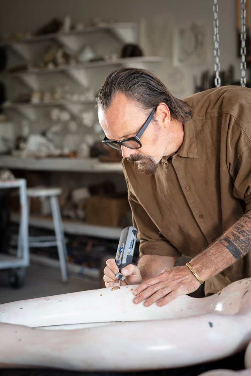 While Gregory’s gallery/showroom, R & Company, displays a curated selection of the artist’s finished work, his studio is like a mash-up of sculptor’s atelier, archaeologist’s lab, and cabinet of curiosities. The assemblage of chairs, tables, lamps, sculptures, objects, and works-in-progress illuminates both the free-range imagination of their maker and the power of his pieces to elicit anthropomorphic projections.