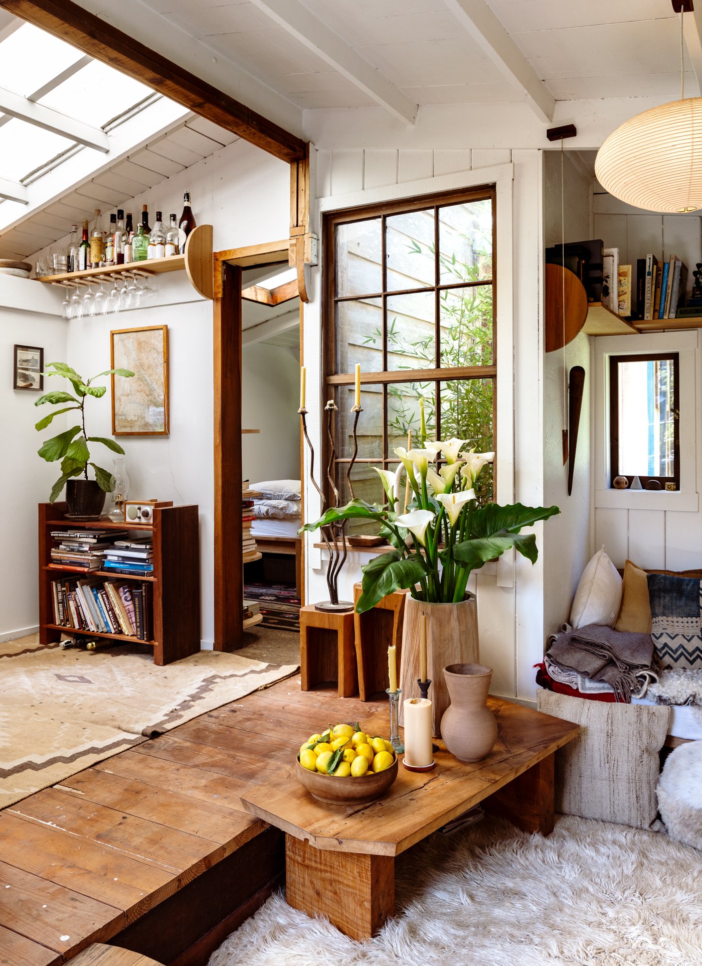 When Yoshimoto, godson of legendary sculptor J.B. Blunk, acquired the 1980s-era structure, it was abandoned and in rough shape. He remade the cabin using wood scraps from his art studio and filled it with handcrafted furniture and objects he collected while traveling or that were made by artist friends and family. The result is a dwelling that’s deeply inviting, with warm wood playing a central role. Yoshimoto, who began as an arborist, showcases various grains throughout, from the floor to the window frames to the tables and benches. In addition, he’s filled his living room, pictured here, with homey necessities like textiles, books, candles, ceramics—some by his father, Rick Yoshimoto—and a fluffy rug. The cumulative result is a room that invites visitors to enter, look around, and stay a while.