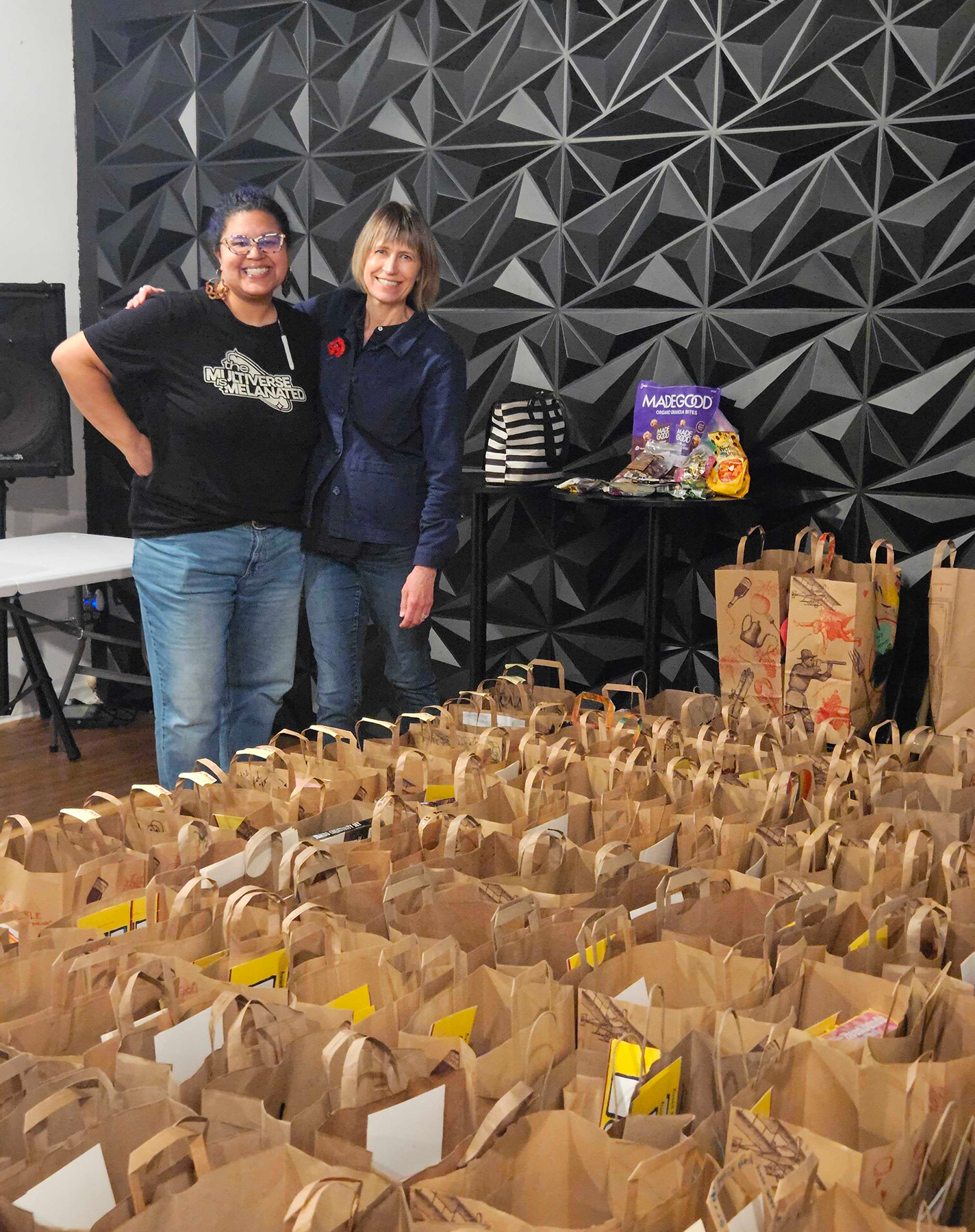 Andrea Specht (right) is part of an ongoing mutual aid project led by Minneapolis-based The BLK Collectors Group, founded by Esther Callahan (left). Project volunteers have assembled and distributed hundreds of kits with art and craft supplies for kids who are sheltering in place with families afraid to leave their homes.