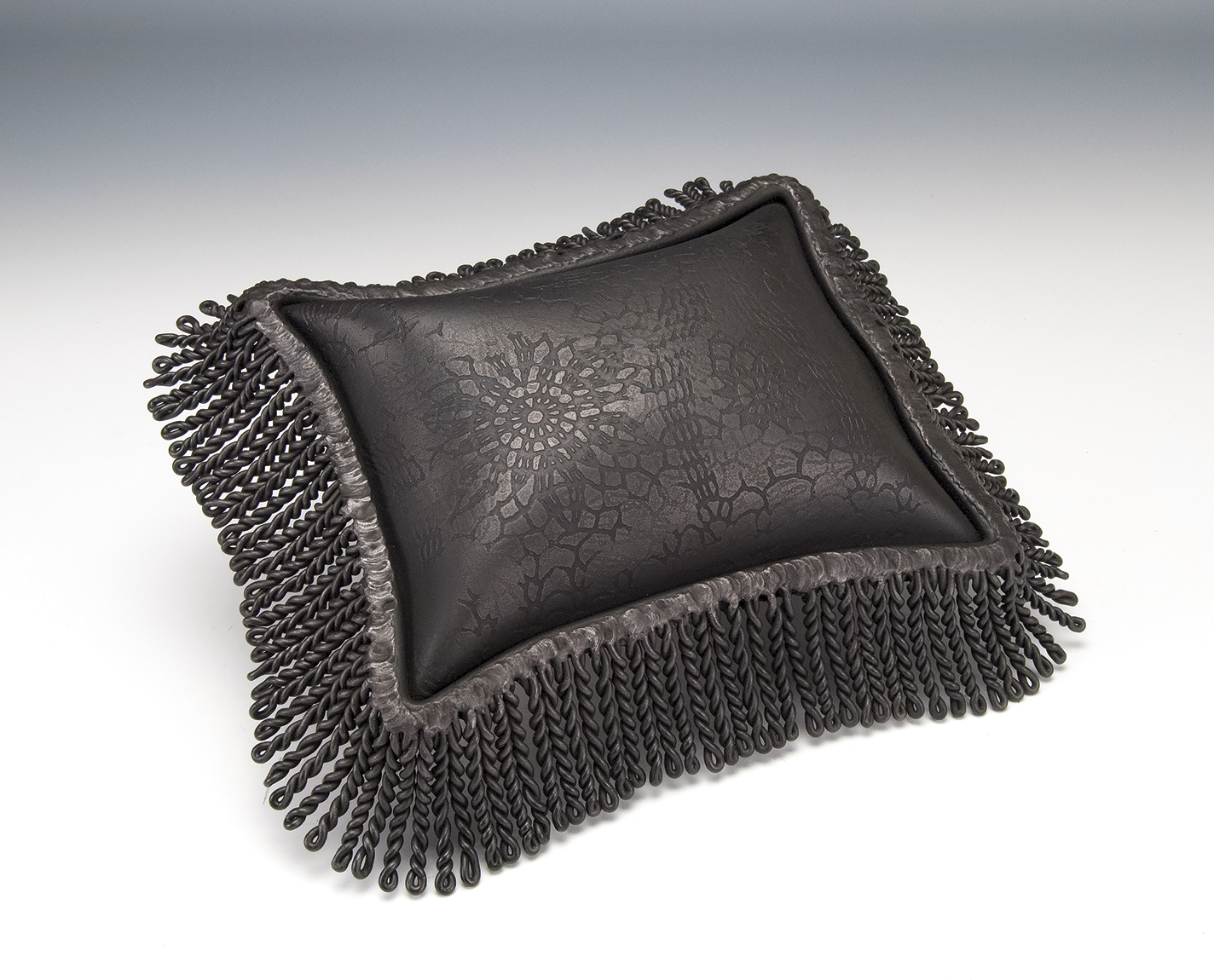 Gothic, 2016, is a pillow in fabricated, inflated, and etched steel with twisted steel fringe, 3.5 x 16 x 14 in.