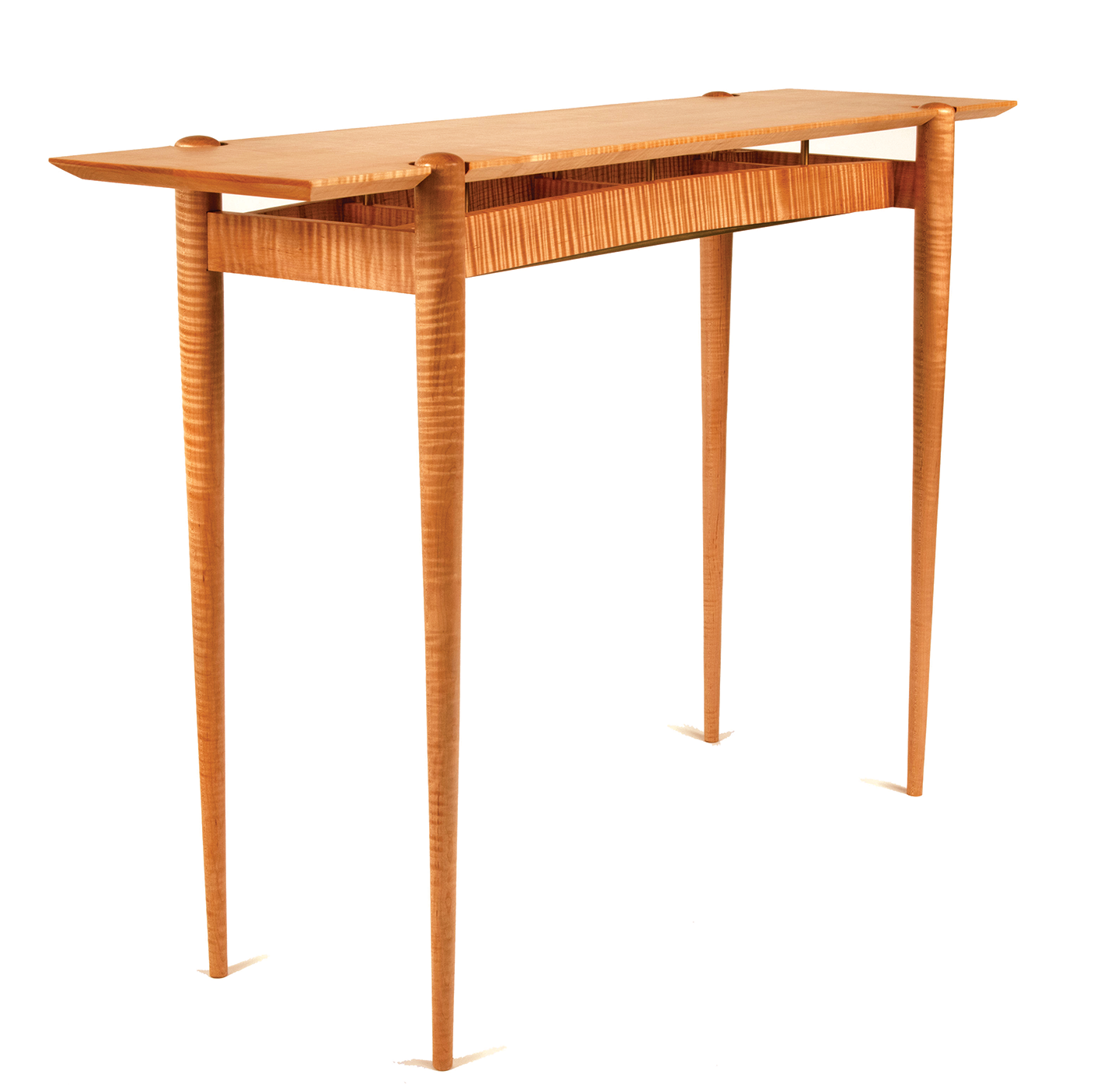 Crafted entirely from tiger maple, the Gazelle Table is intended for a hallway, 2024, 48 x 33 x 13 in.