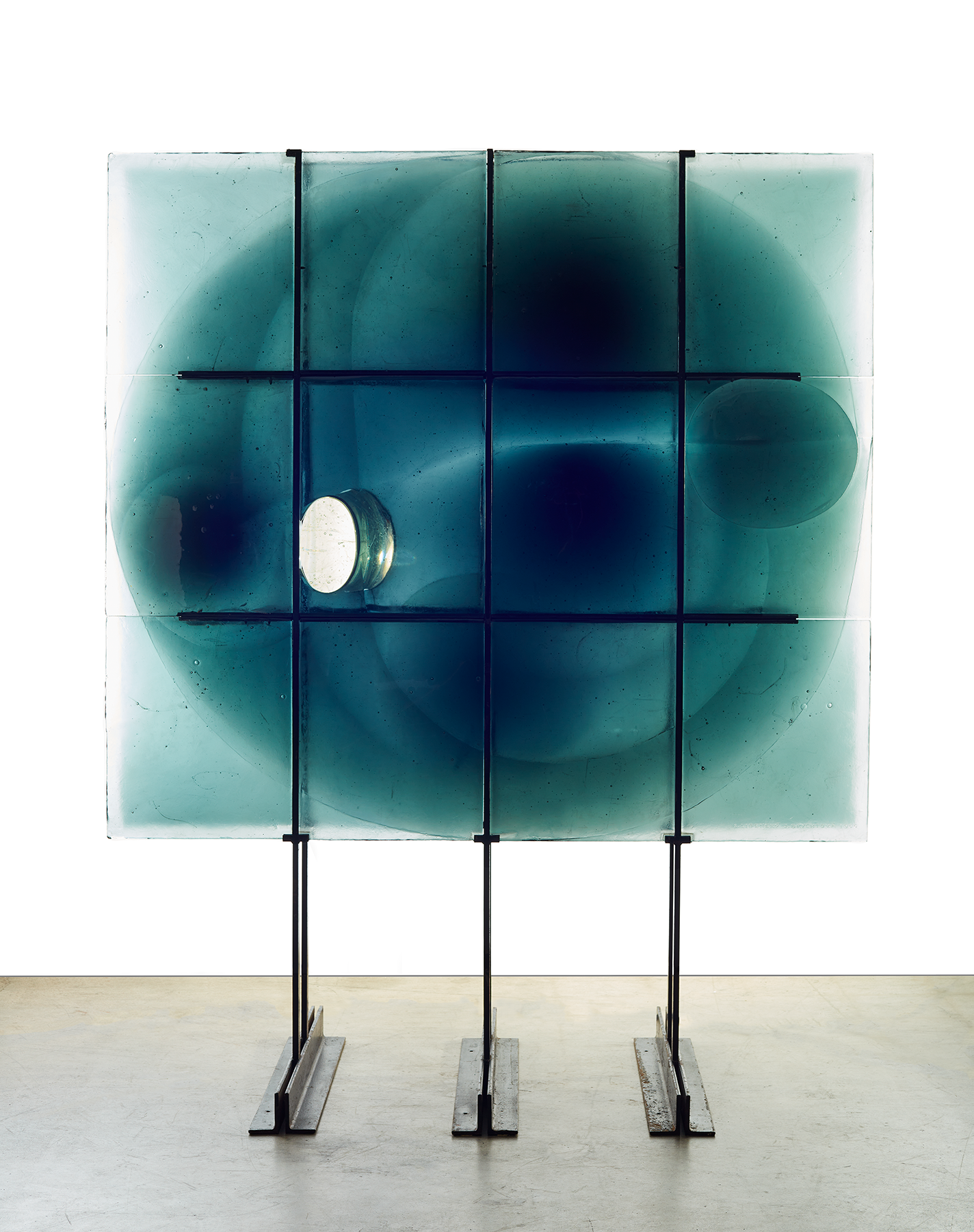 The centerpiece of Abstraction and Ourselves—a new exhibition at the Cafesjian Art Trust (CAT) Museum in Shoreview, Minnesota—is a wall of glass: two cloudy blue panes, linked by a clear cylinder, that somehow both threaten and uplift.