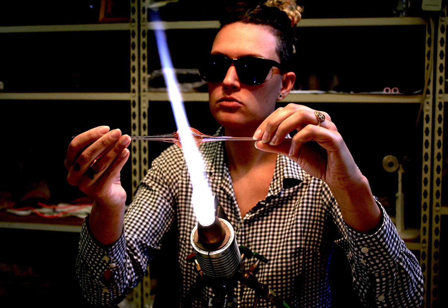 Post Eskuche works out of her home studio outside of Pittsburgh in Turtle Creek, Pennsylvania, which is equipped for flameworking, kiln fusing, and metalsmithing. From 2019 to 2021, she completed the Core Fellowship at Penland School of Craft, where she learned the metalsmithing skills she now uses in her flameworked jewelry. For some processes, she still rents hot-shop time at the Pittsburgh Glass Center, where she also teaches. “It keeps me in my local community of glassworkers,” she says. She sells her jewelry and functional wares through her design brand Ultra Lit, which she began developing during her time at Penland. (She cribbed the brand name from a pen name she used in college while writing about her mixed-race identity.)