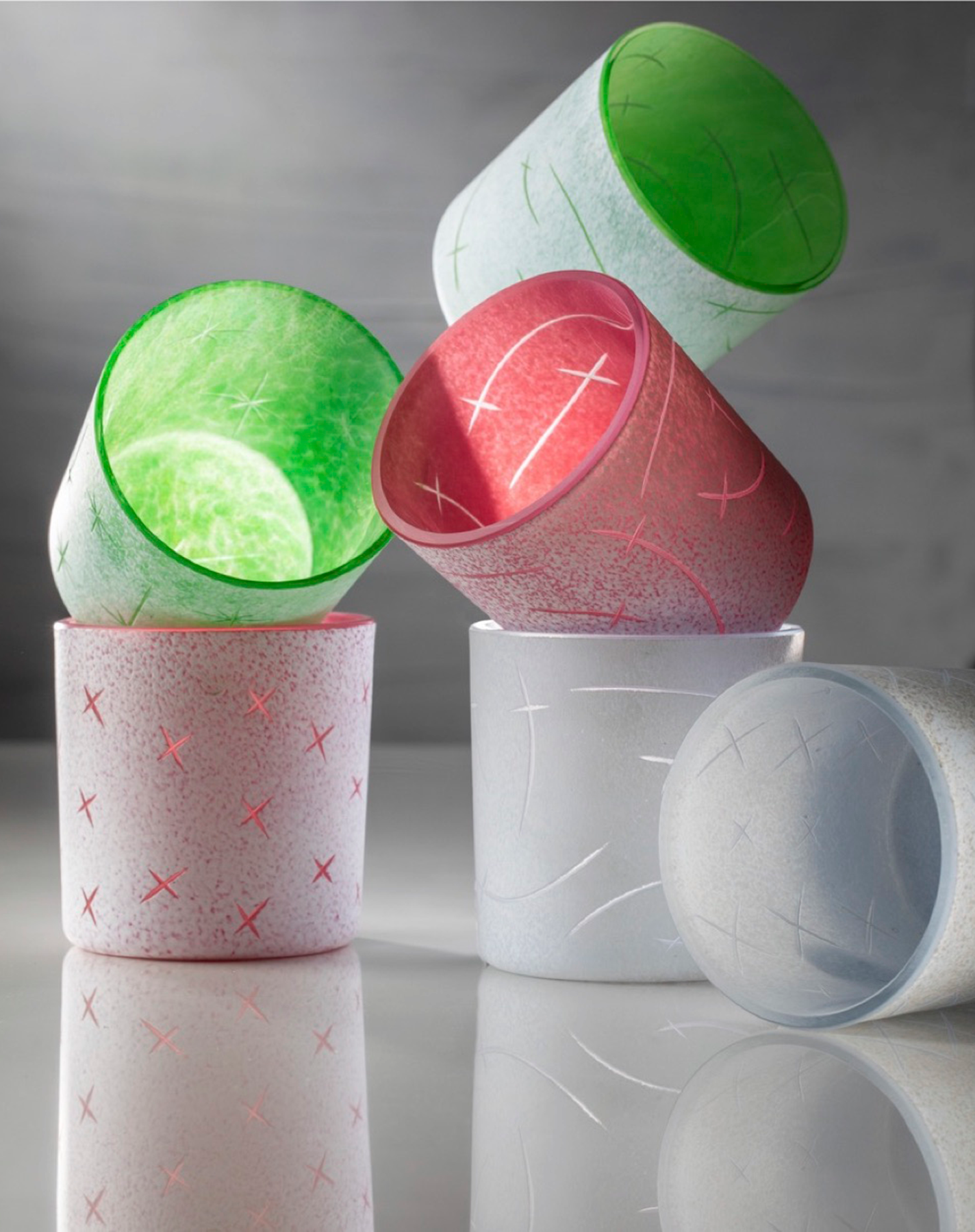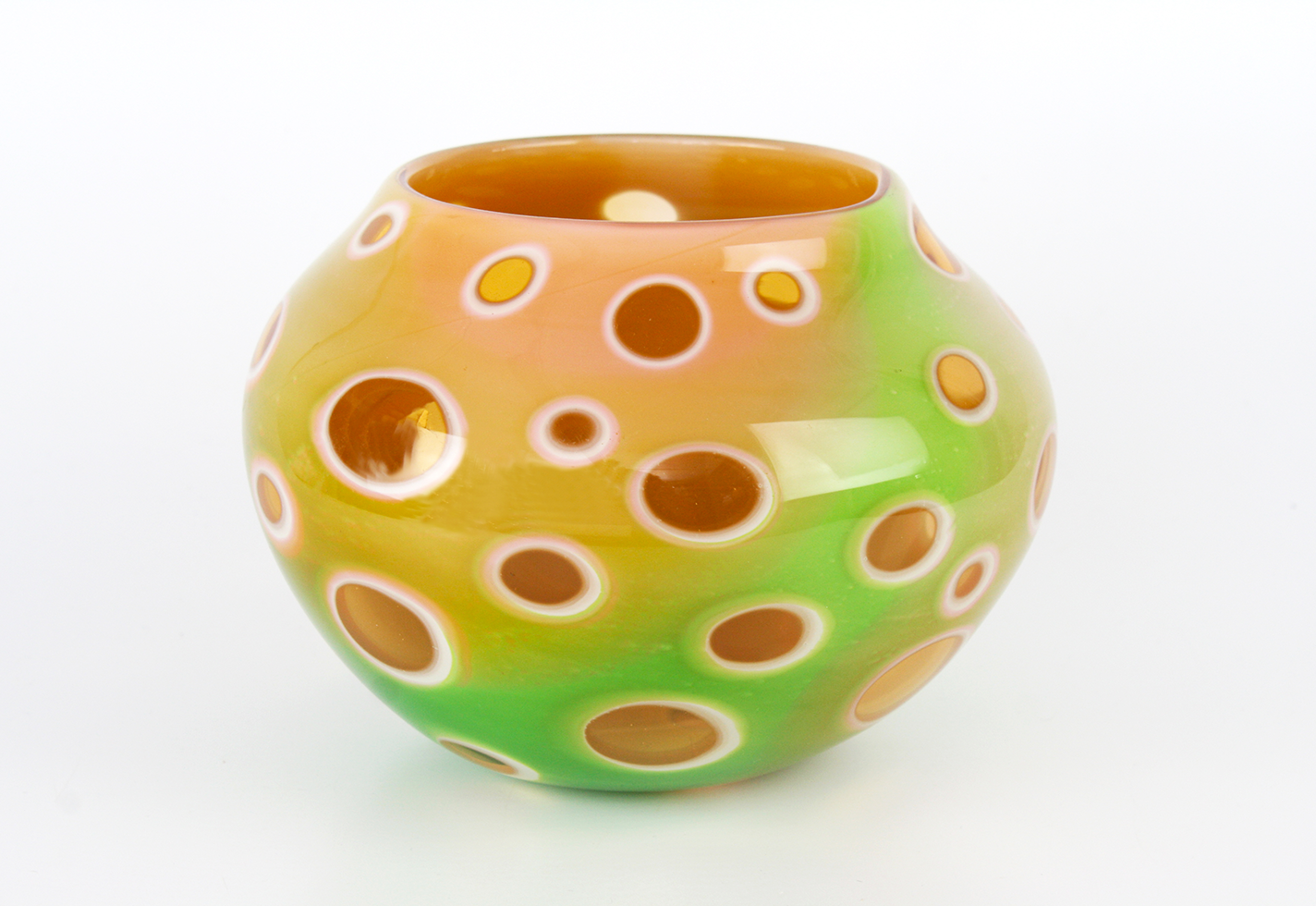 Using this complex technique, known as Graal, allows Post Eskuche to work bigger and use carved designs—which are typically limited to smaller cups and dishes—on larger-scale pieces. In Mango, carving the glass before blowing the final shape produced large circles of transparent glass. It’s a risky and somewhat grueling process that stretches over at least three days, but the resulting vessel glows as dots of light dance across its saturated green-and-peach surface.