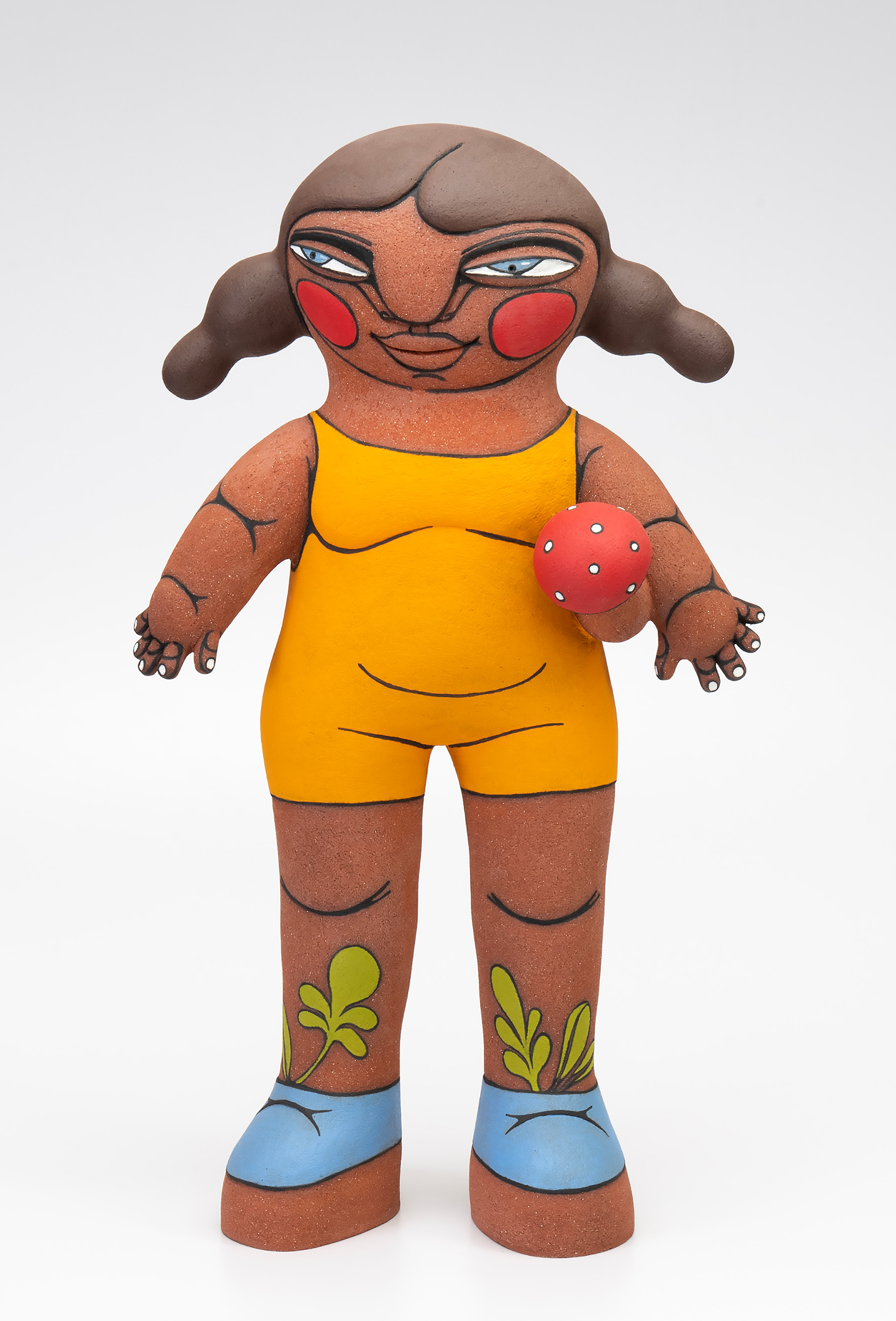 In the window area of the St. Louis–based Duane Reed Gallery, there’s I Love Mushrooms, a 24-inch female figure in a yellow jumpsuit with a bright-red mushroom under one of her stubby little arms; her wide, narrow blue eyes look out on the viewer steadily, and maybe a little suspiciously. She has red discs on her cheeks—bigger and somehow more serious than a clown would have.