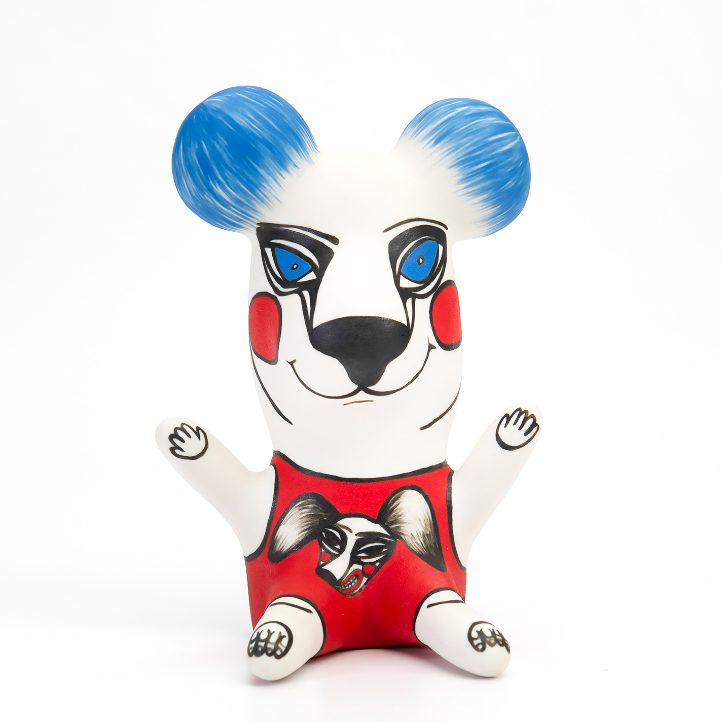 There’s also Tiny Neighbor, a 14-inch-tall gray squirrel-like creature, seated on its rump, who also seems to have some wolf DNA. His body is “dressed” in the images of two women, one with white hair and the other with red, who share the mushroom woman’s enigmatic look: intense and focused, but on what? And Ready to Conquer the World is a person in pink racing shorts, blue shirt, blue helmet-ish hat, and flip-flops, who seems about to step into some unknown but cartoonish future.