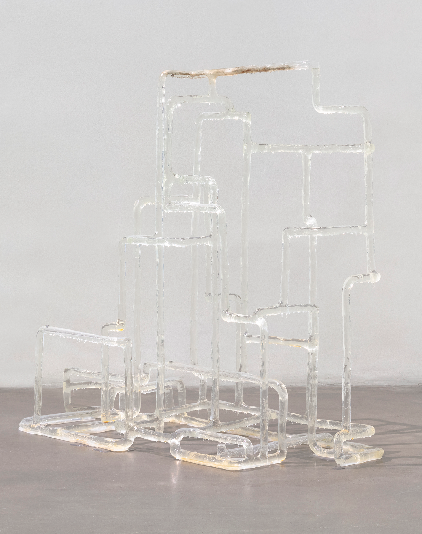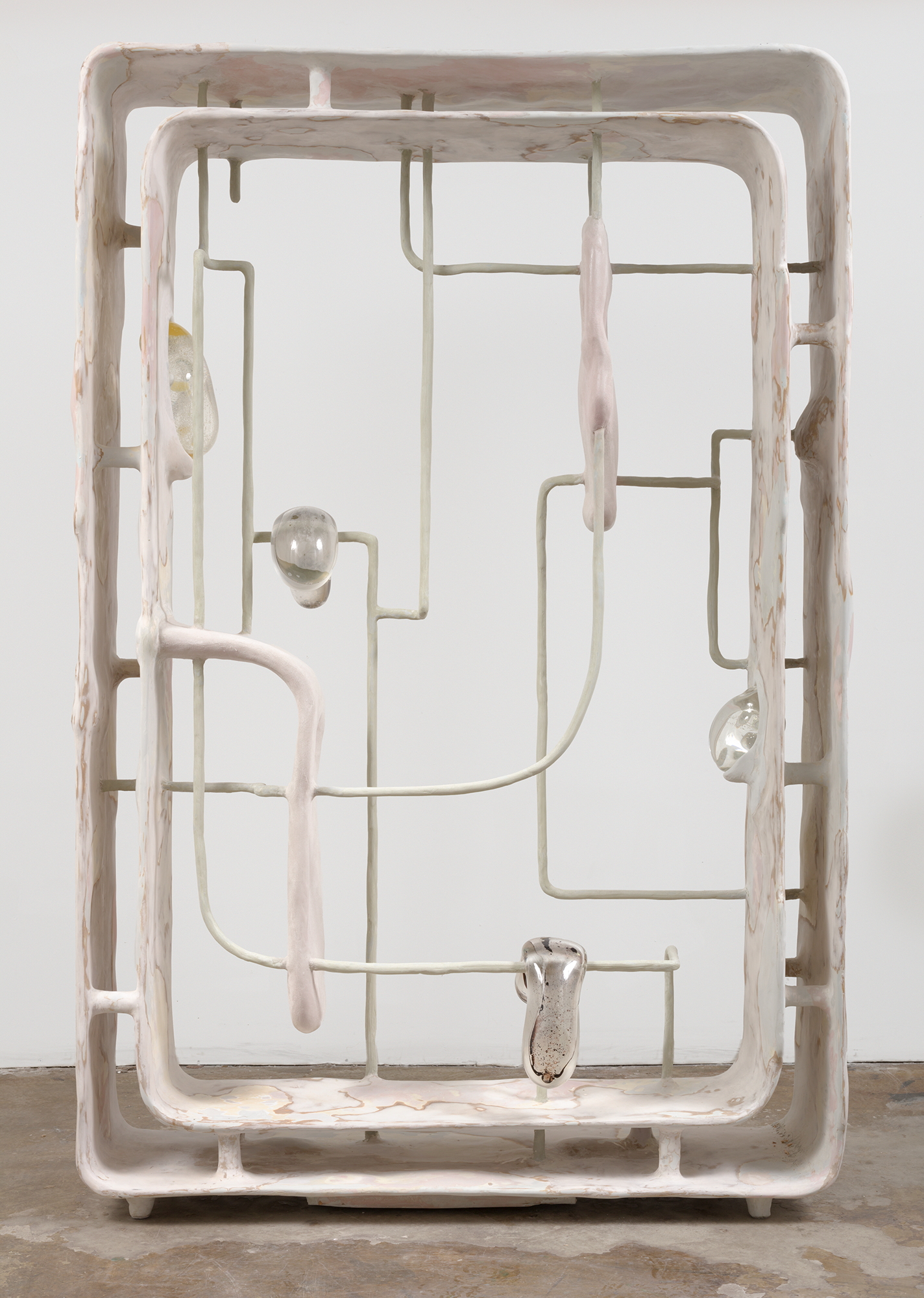 In Form Begets Function (2020), Fan precariously drapes blown glass capsules containing testosterone, melanin, and urine on a human-scale biomorphic rectangular lattice made of wood, fiberglass, and resin. The form itself references a classical Chinese scholar’s shelf used to display collections. By suspending the biological materials in glass, outside the context of the body, Fan explores the intersection of identity and biology and challenges constructs of gender and race, themes that they return to often in their work.