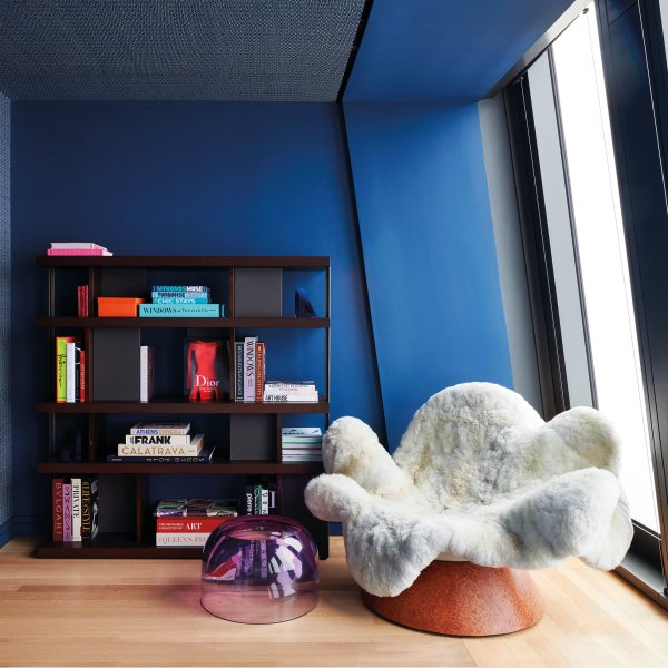 In 2018, while working at the studio for designer Fernando Mastrangelo, Cochran produced his first cast-polyurethane piece, a coffee table constructed of five solid resin slabs—dyed to a glossy violet sheen—and a piece of cut colorless acrylic. As in traditional Japanese wood joinery, each slab notches into another without hardware so that the near-ovular acrylic tabletop rests on, and shows off, gracefully angled supports. This interlocking technique, which causes the resin to reflect against itself and creates rippling layers of color and shadow, has become Cochran’s signature. Over the past five years, he has produced shelves, side tables, chairs, mirrors, and more that seem effortless in their clean, streamlined appearance.