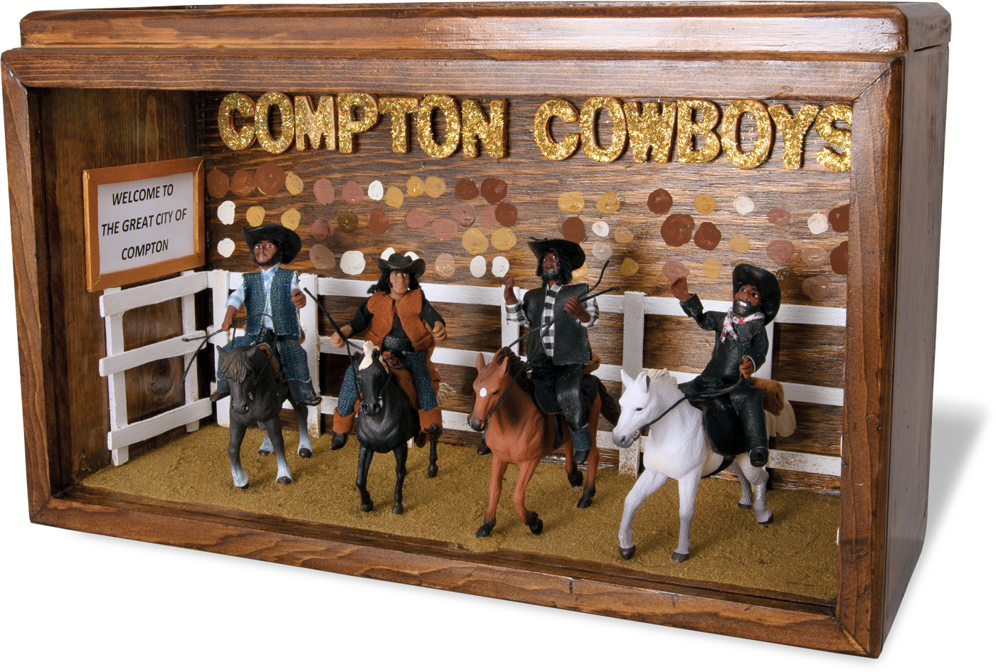 Collins’s singular work has earned an enthusiastic following. Recently, she created a series of dioramas depicting Black cowboys and scenes from the life of an early Black U.S. Marshal for the Autry Museum of the American West. Her dioramas—each intricately constructed within a rectangular “shadow box” with shallow wooden walls—capture dozens of pivotal moments rendered in three dimensions. Most contain miniature clay renderings of influential Black activists, entrepreneurs, and political leaders, as well as families enjoying hard-won victories in the face of widespread abuses.