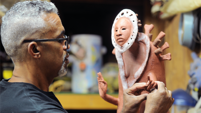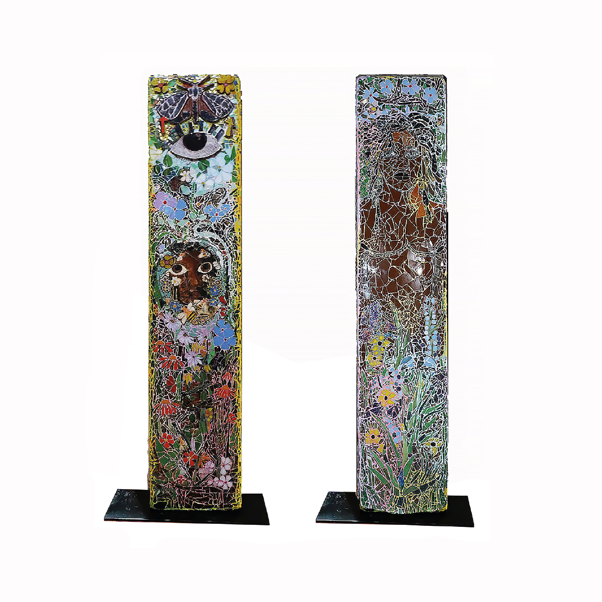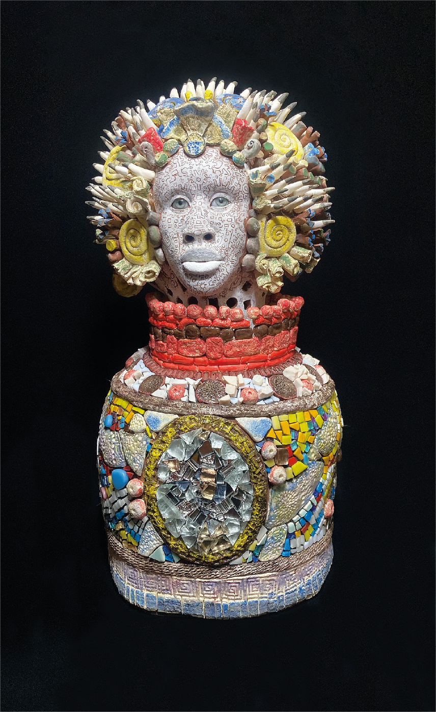Today Malone, based in Maryland, makes striking clay figures and complex mosaic sculptures. Through them he tells stories about his “unknown African past” and expresses his spirituality. The faces of his intricate busts and dolls are often looking up or frowning or fixing the spectator with a piercing gaze.