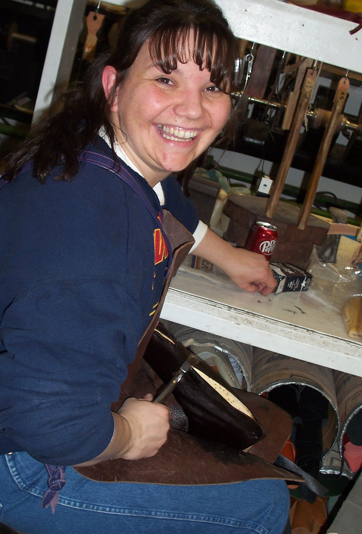 Julia Schwarz primarily works on the tops of the boots. Here she crimps a vamp, the boot's upper.