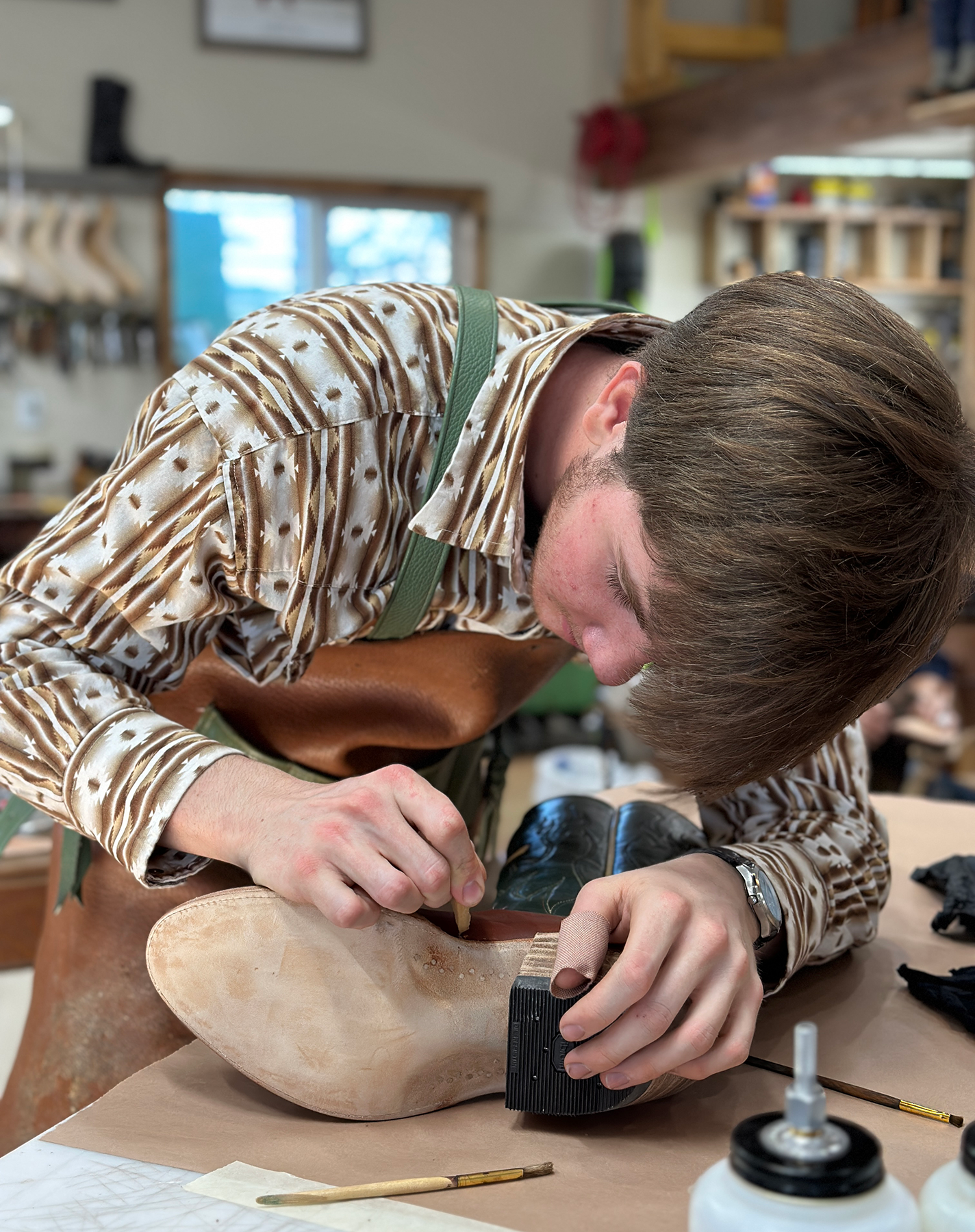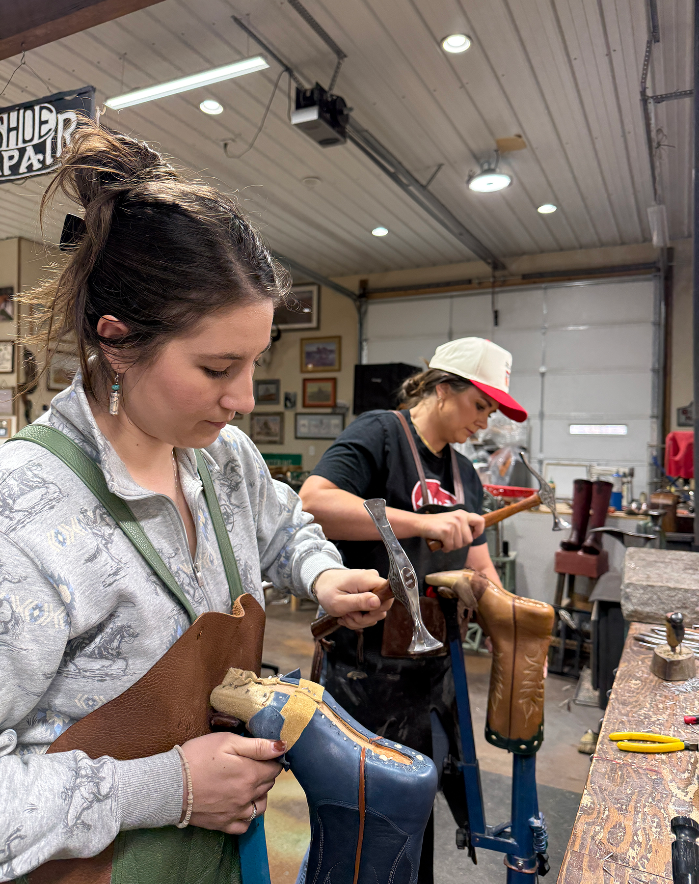 Conversation in the shop comes and goes throughout the day. Sometimes the couple works quietly with music playing; other times, the talk shifts between the boots on the bench and the ordinary logistics of daily life. The routine reflects the rhythm they’ve developed over 20 years of working side by side.