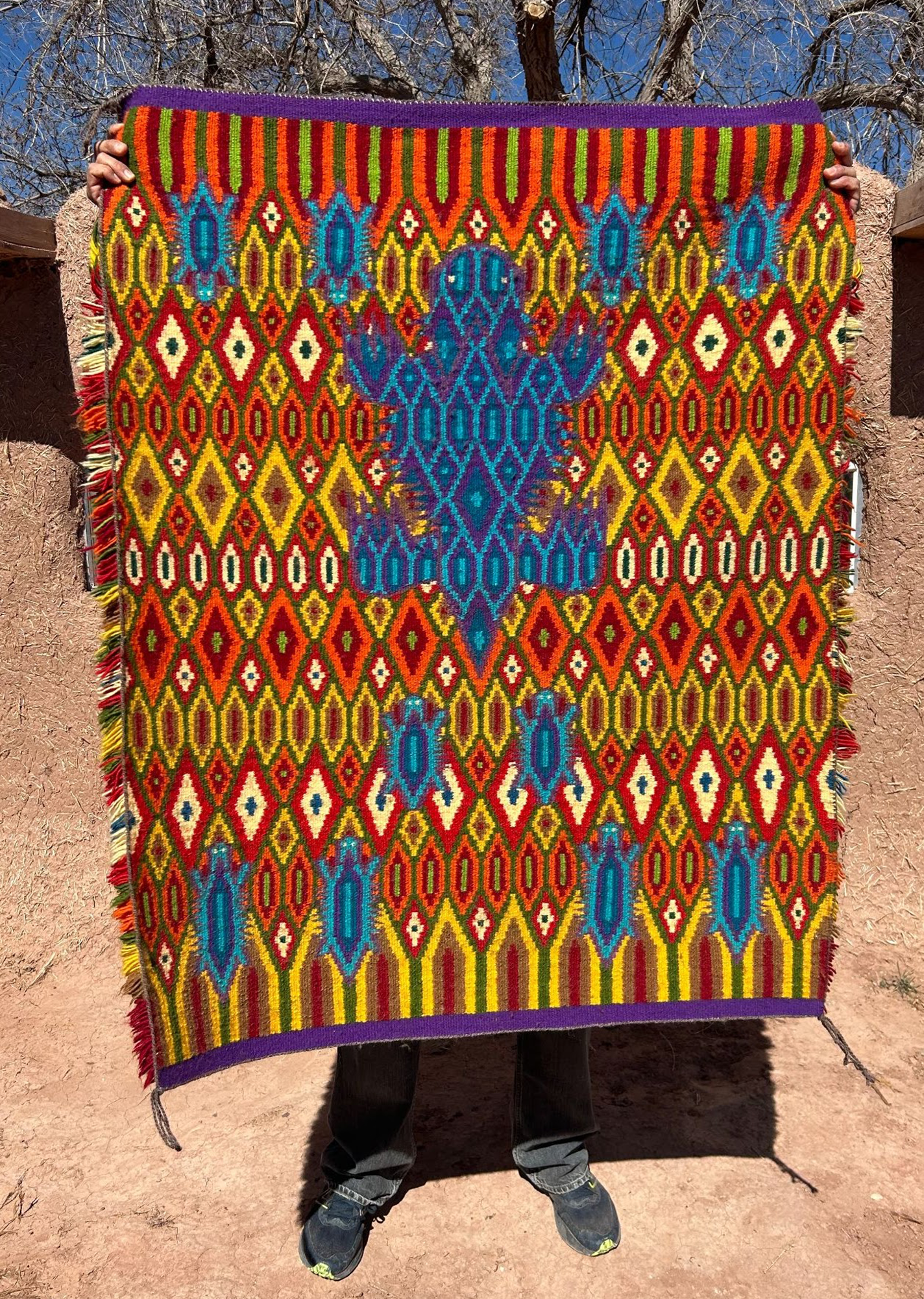 Tsosie describes sheepherding as reciprocal. “You take care of the sheep, and then they take care of you. They feed you, they clothe you, they keep you company.” From there, his work continues by hand: shearing the sheep, cleaning and carding the wool, spinning it into yarn, and dyeing the skeins with natural pigments before they reach the loom. Tsosie’s finished textiles are kaleidoscopic, with colors derived from earth materials like chamisa, lichen, and walnut, all gathered from the land or acquired through exchange.