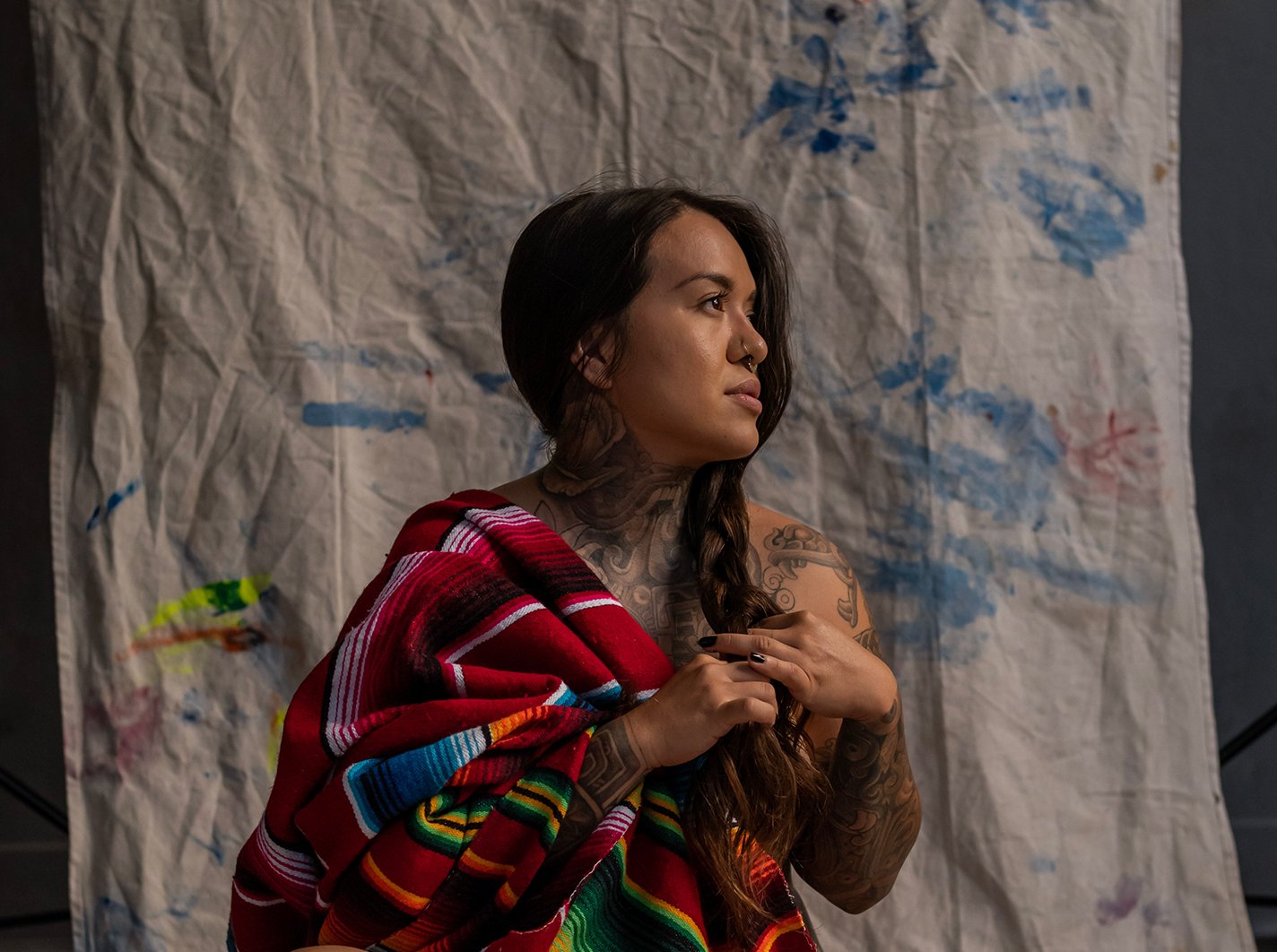 During the pandemic, I was living with my in-laws, who are immigrants from El Salvador. While we were under lockdown, I began to grow frustrated with my lack of access to my painting studio. My mother-in-law, who grew up embroidering through the Salvadoran Civil War, taught me how to add textiles to my visual language.