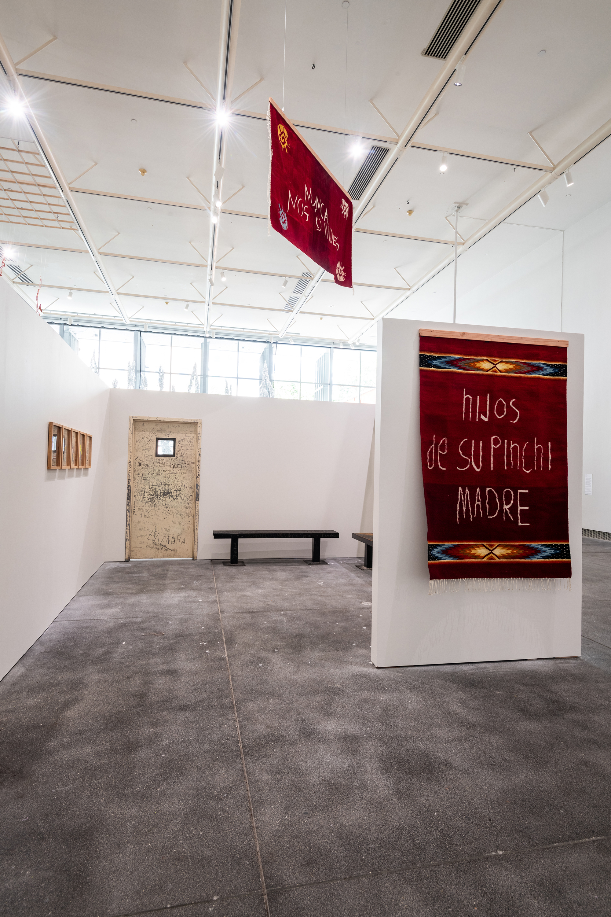 Installation at Bay Area Now 9 at the Yerba Buena Center for the Arts in San Francisco, featuring the textile Oracion de Prision / Prison Prayer by Arleene Correa Valencia and Jacobo Mendoza, alongside doors and benches from an immigration detention center.