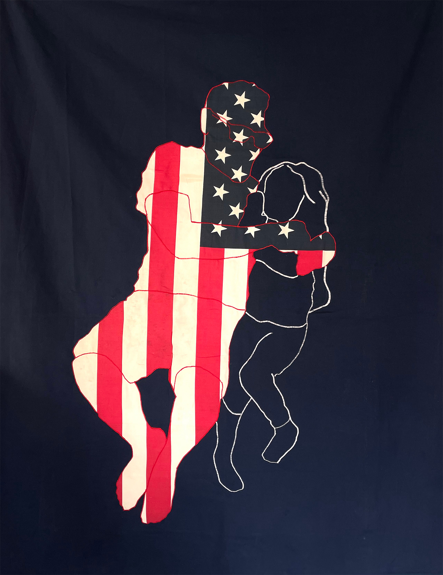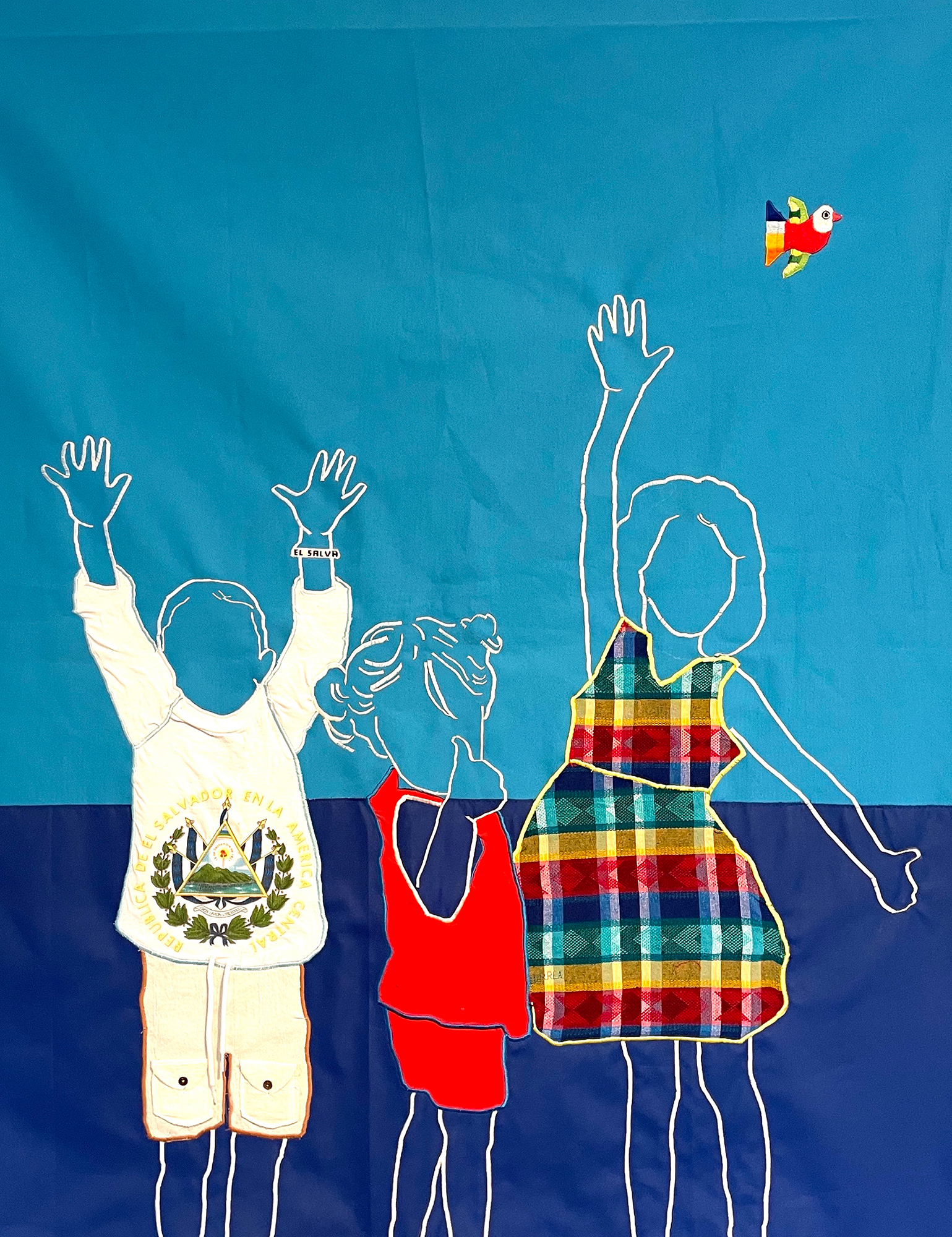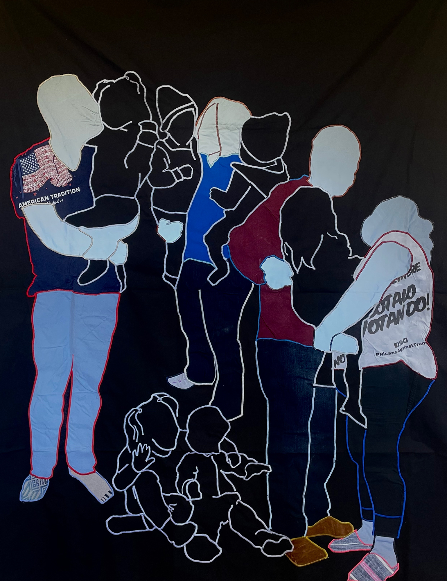 Cuarto de Reunion #1: No Te Preocupes Hermanito, Ahorita Nos Toca a Nosotros. Volveremos a Ver a Mama y Papa. / Reunification Room #1: Don’t Worry Little Brother. It’ll Be Our Turn Soon. We Will See Mom and Dad Again., 2022, repurposed textile on black canvas, 72 x 57 in.
