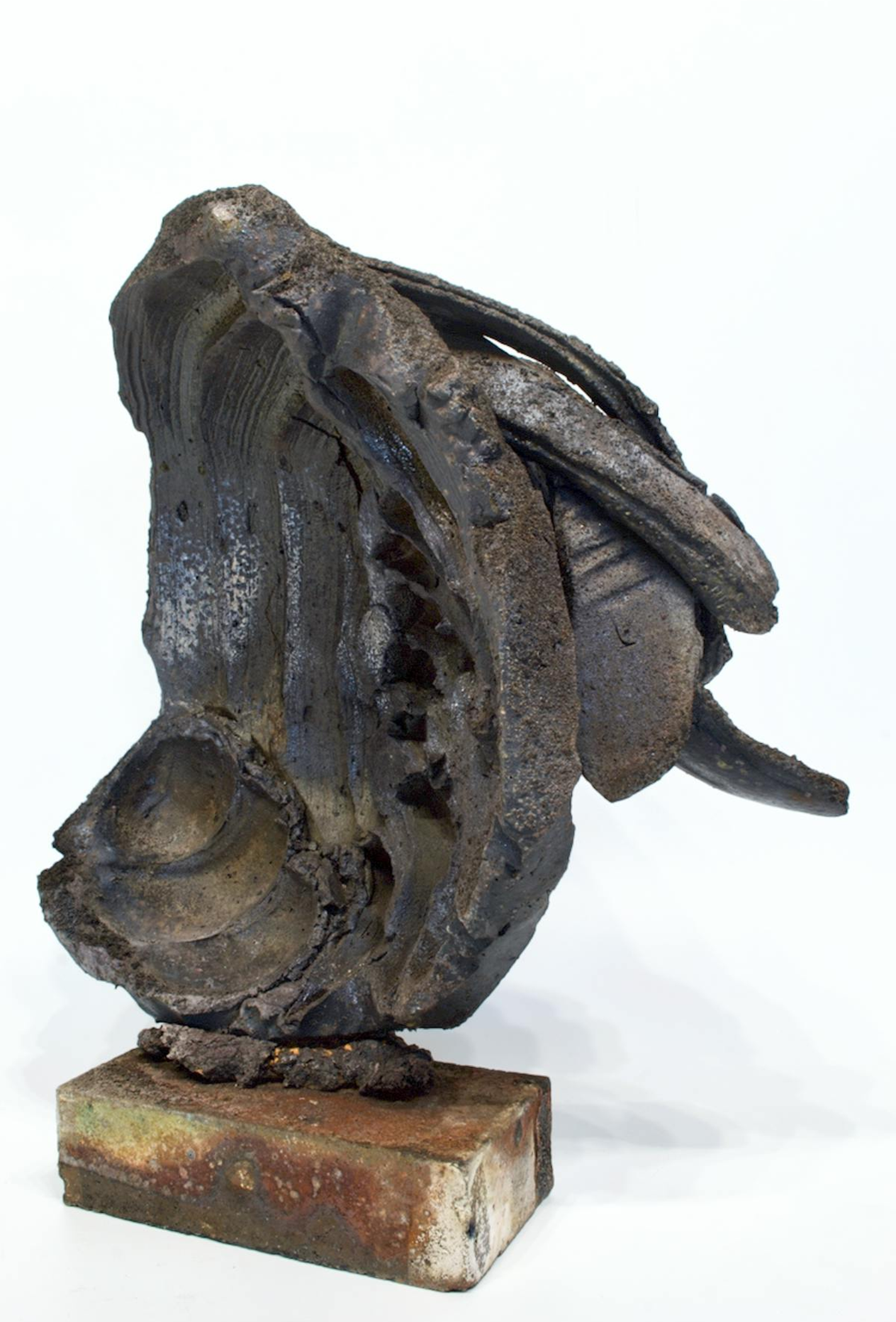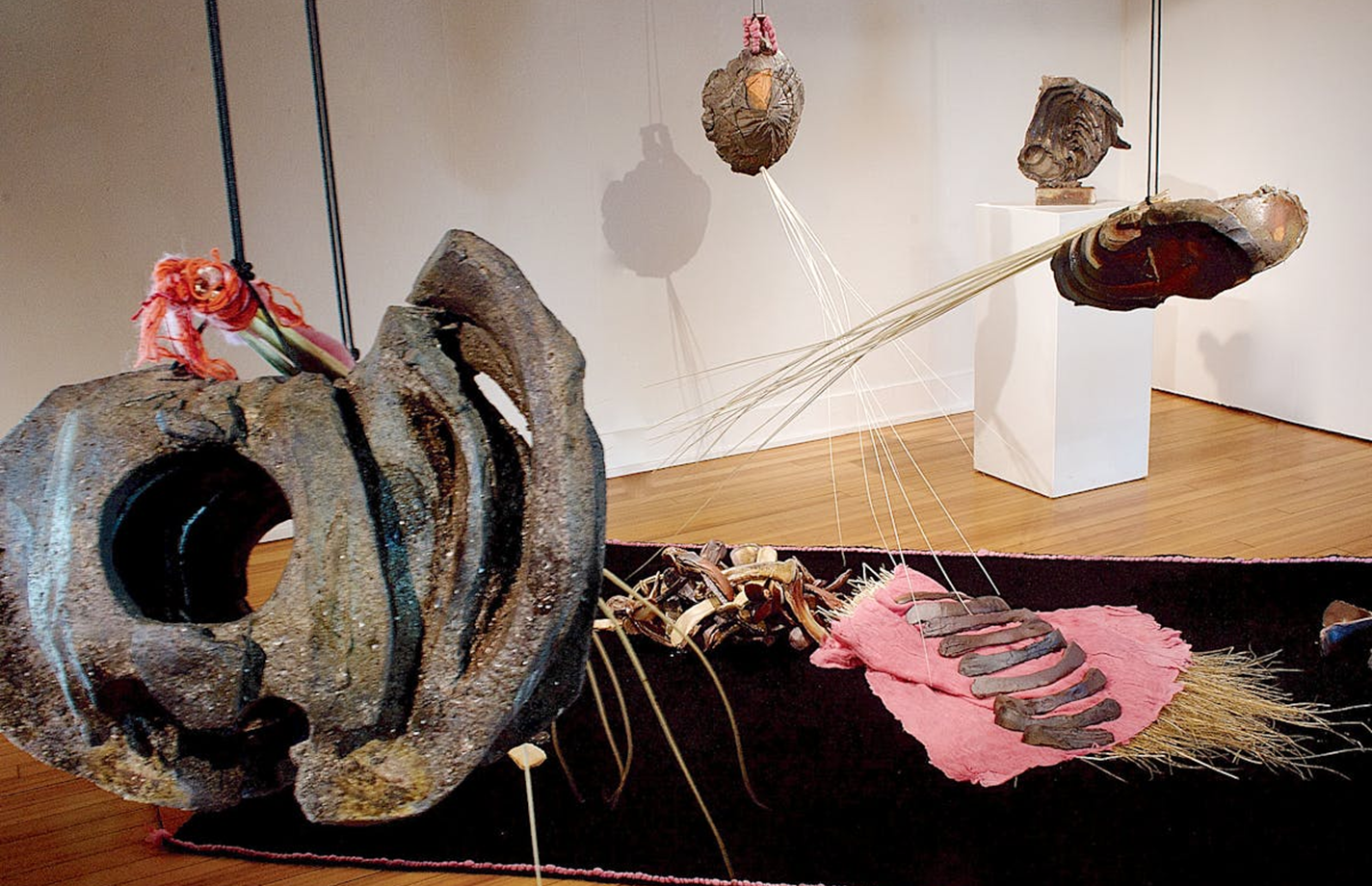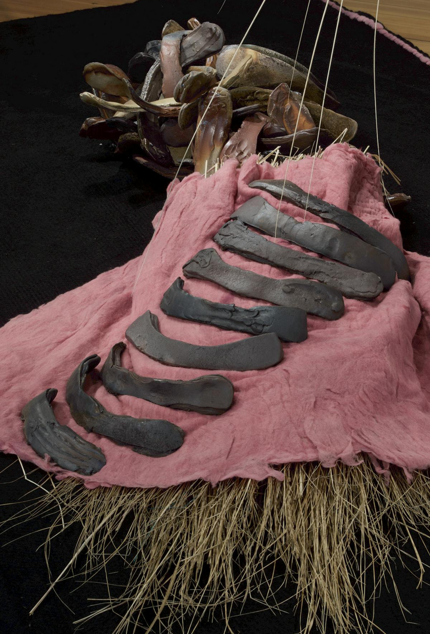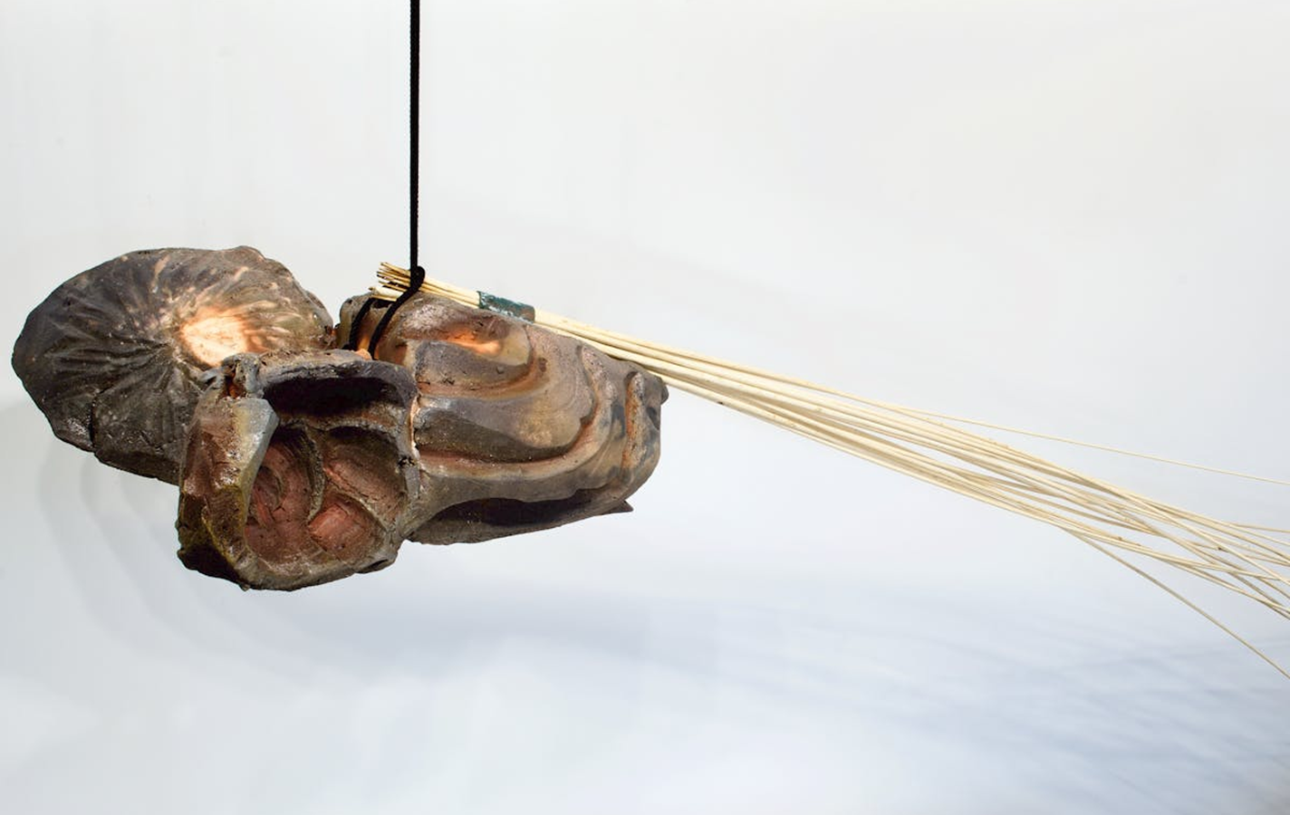 I find the marks from the movement of the clay beautiful and fresh. I try to touch the clay in ways that leave in the expressiveness of the material. The Core Reverberations pieces are composed of clay parts carved from solids or thick slabs, and assembled from stretched parts that sometimes broke or tore during the stretching. I mend the tears, allowing the overlaps and finger-marked joints to show. In the reductive segments, the cut markings are left by carving tools when they drag chunks of impurities from the local clay. Other additives, such as perlite, lend visual rawness. I don’t often smooth them over, and I try to not overwork them. It’s the same with other materials that become part of the sculptures, such as grasses that bend with time and sea whip skeletons that catch air currents and cause the suspended clay sculpture to move.