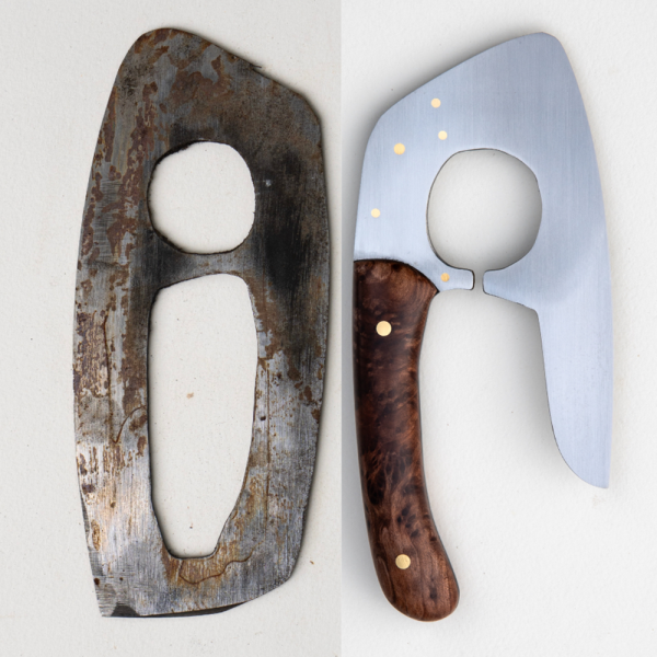 Noel’s 2024 knife Night Sky Ulu is made of redwood from the estate of JB Blunk, carbon steel, and brass.