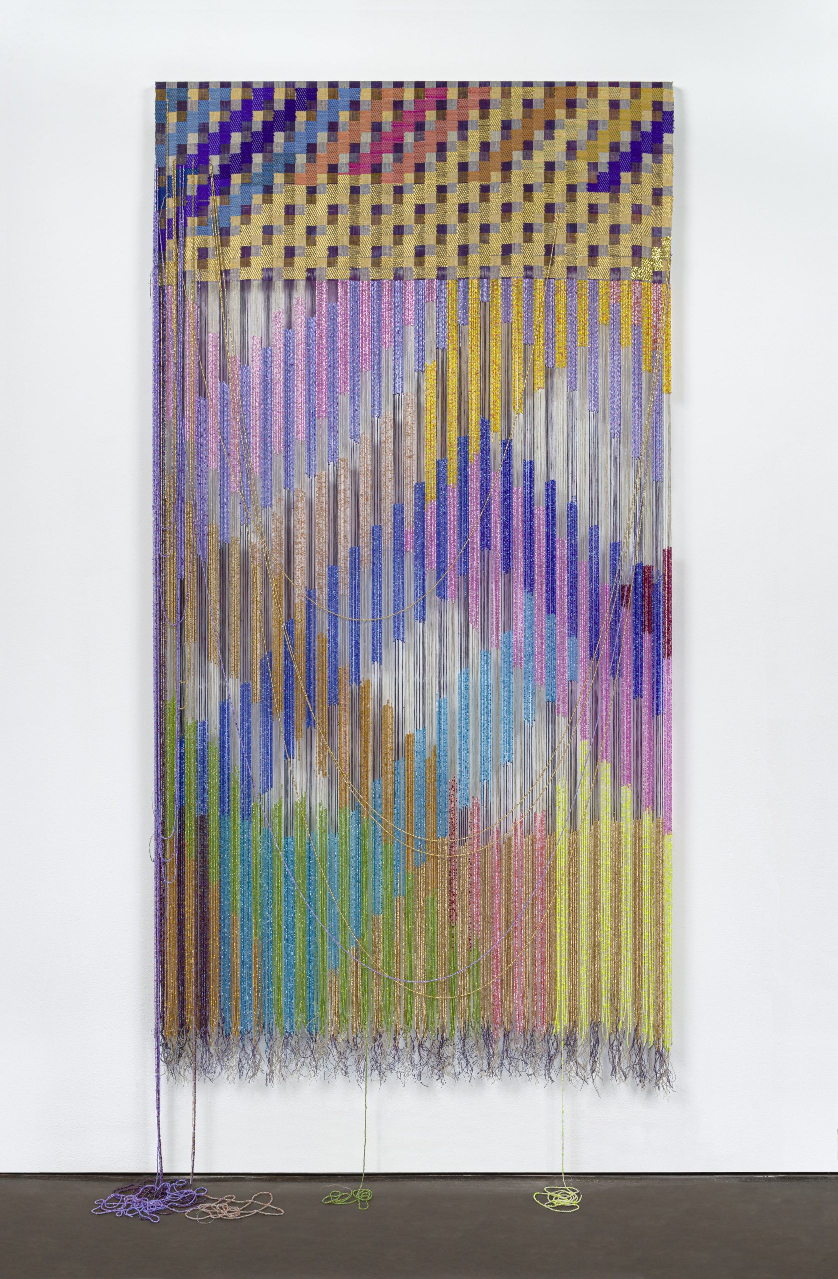 The long strands of beaded fringe in my work retrace the beaded-curtain works of Félix González-Torres. His audience would break through his beaded walls in an erotic and metaphoric passage through the veil between life and death. Echoing this, my tapestries enact queer form by focusing on the unwoven fringe rather than the body of the weaving. Occupying the space between tapestry and wall, the beaded fringe dangles in a state of liminality—it is the queerest element of the weaving.