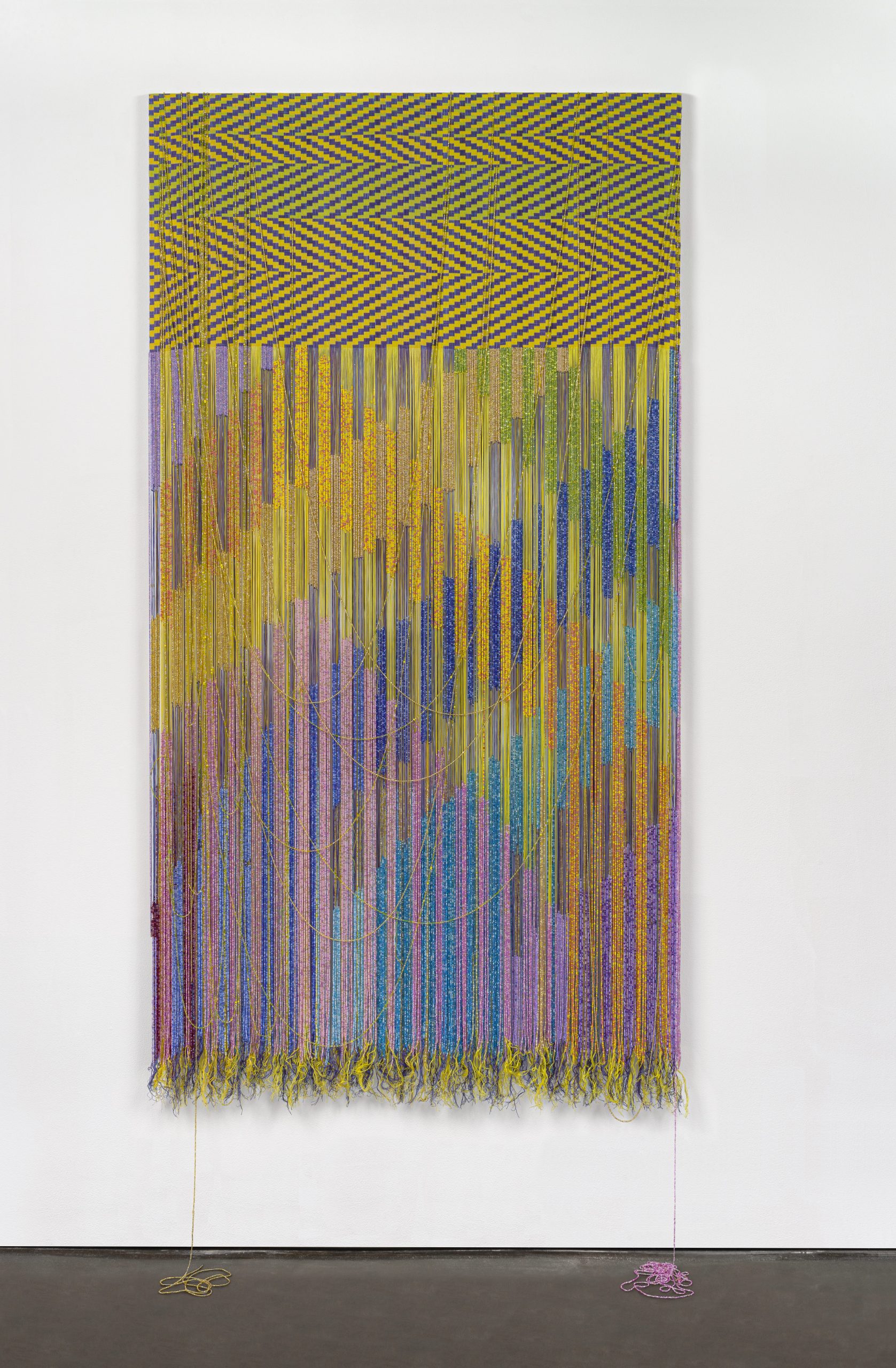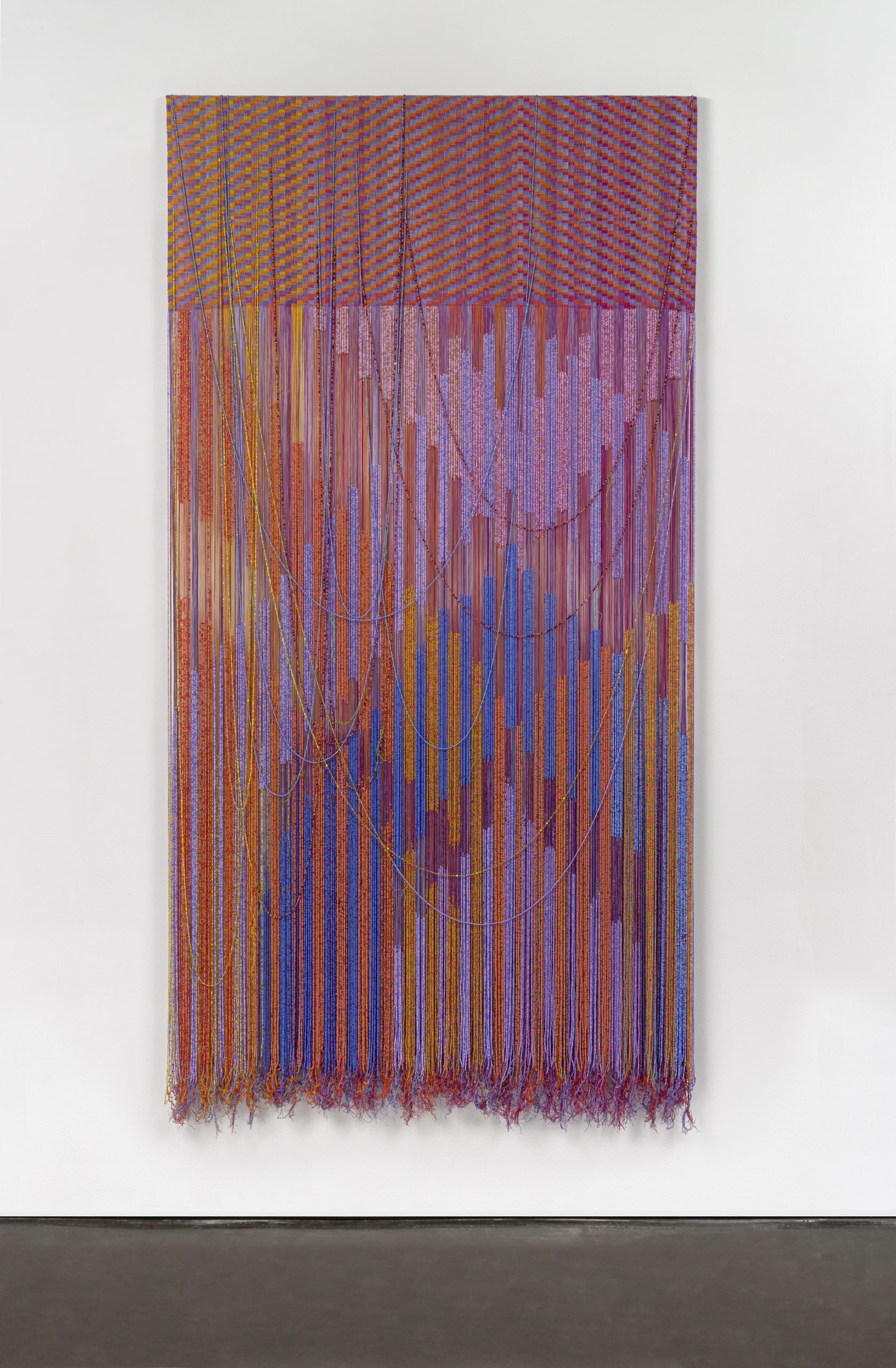 I’ve been reaching for the feeling created by the sad gay disco songs of artists like Sylvester and Donna Summer. There is the thrumming beat, the rapid electronic percussion, the haunting falsetto wail.… Your heart breaks but you keep dancing. I bring these rhythms with me into the studio. Within the matrix of the loom, I engage ecstatic improvisation as a methodology to move beyond language and access the queer imaginary. I see this tectonic improvisation as akin to dancing.