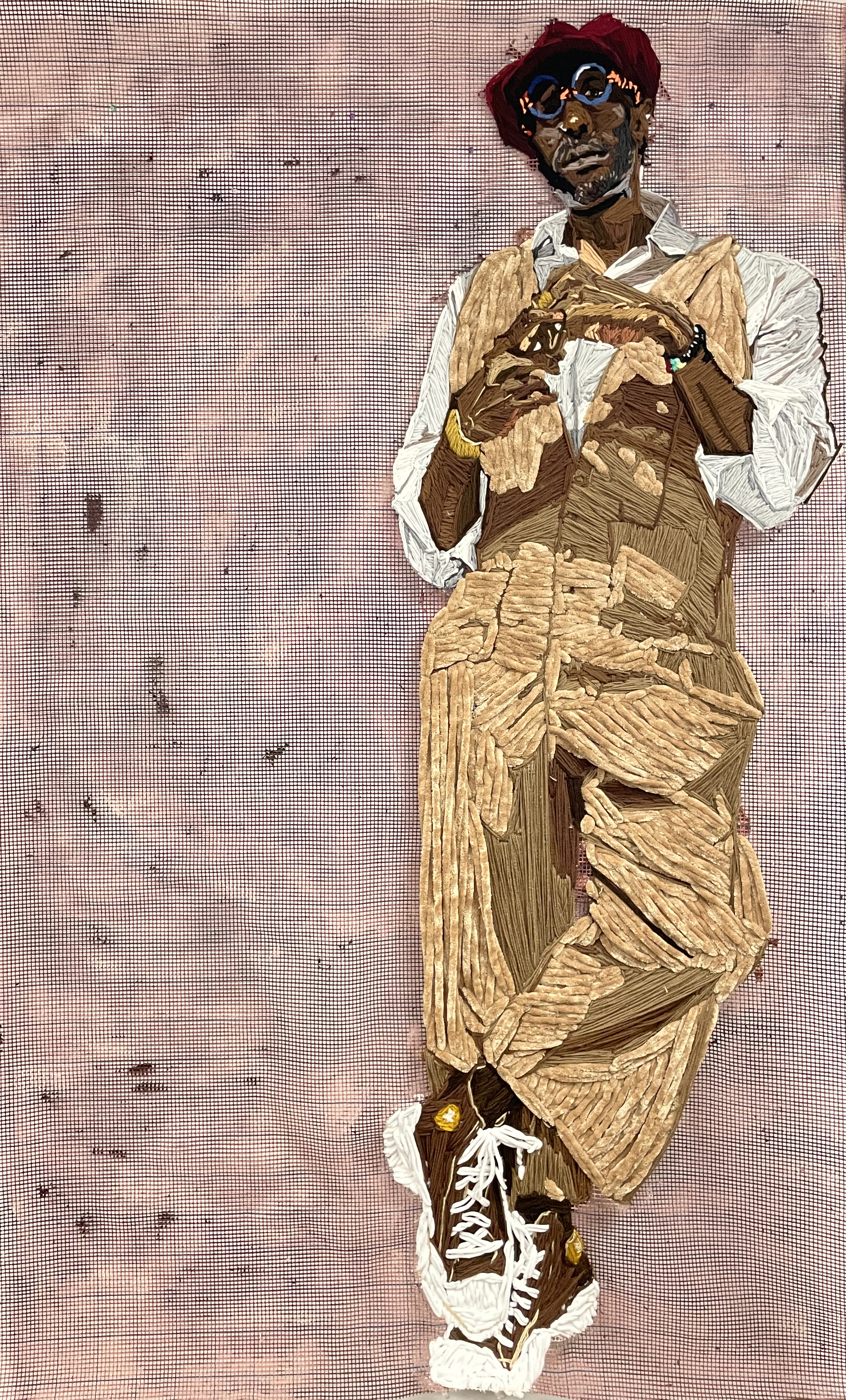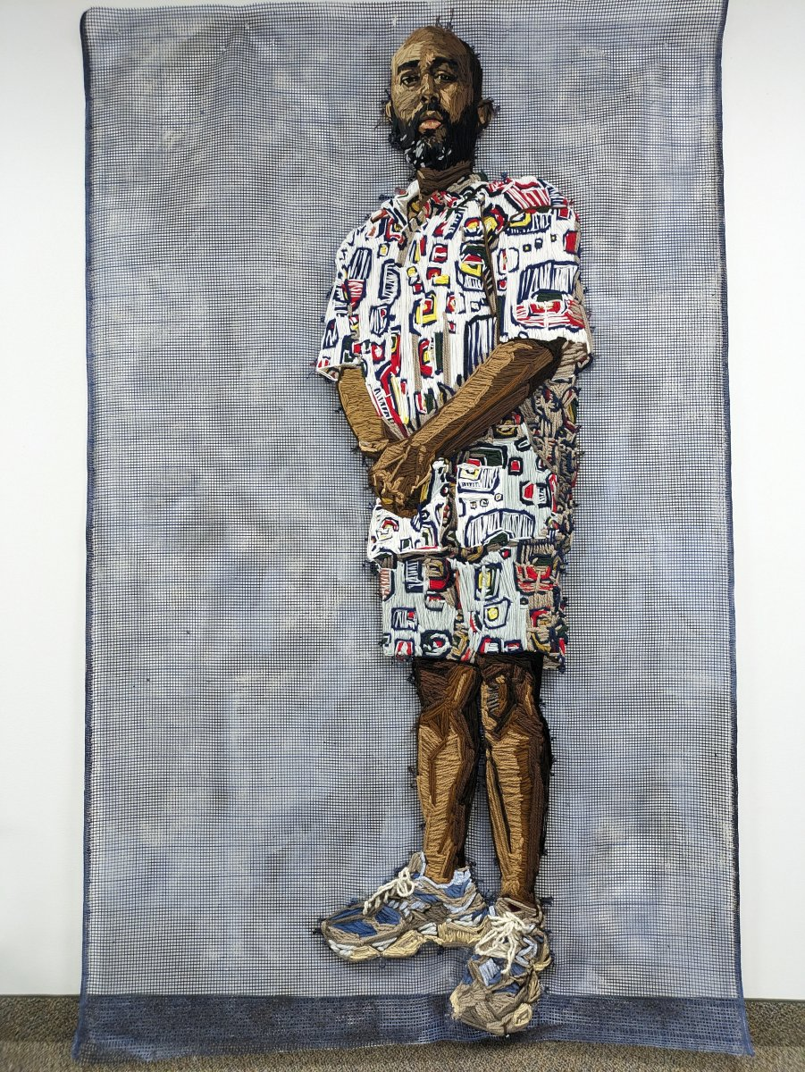 In fiber, stained glass, and oil portraits, Lopez captures the personalities and style of people of color. The Afro-Caribbean artist, who lives in Fort Lauderdale, Florida, and teaches art and design at Nova Southeastern University, creates expressionistic portraits in thread and yarn on larger-than-life plastic mesh canvases, depicting her subjects’ highly detailed eyes, vivid clothing, and confident poses. Loose threads dangle off the canvases, as if the subjects might dance or wander off into the room. Though she has only been focusing on craft art since 2021, her work is powerful and self-possessed, demonstrating a strong sense of color theory and a painter’s eye for detail. Lopez wrote about her daily creative rituals—and the M&M’s and Bustelo coffee that fuel them—in “Rituals of Making” in the Spring 2024 issue of American Craft.