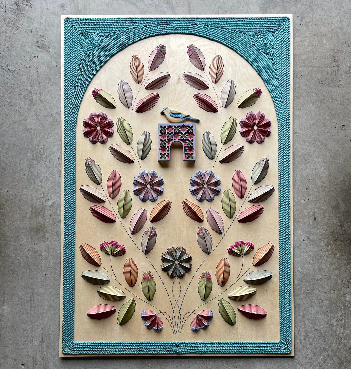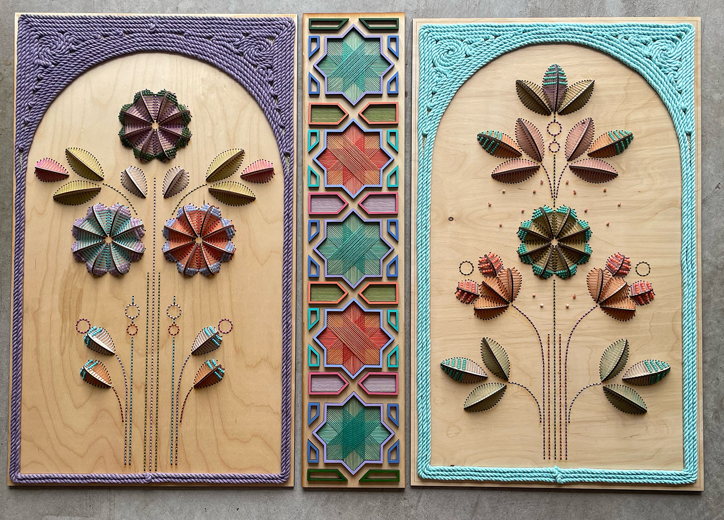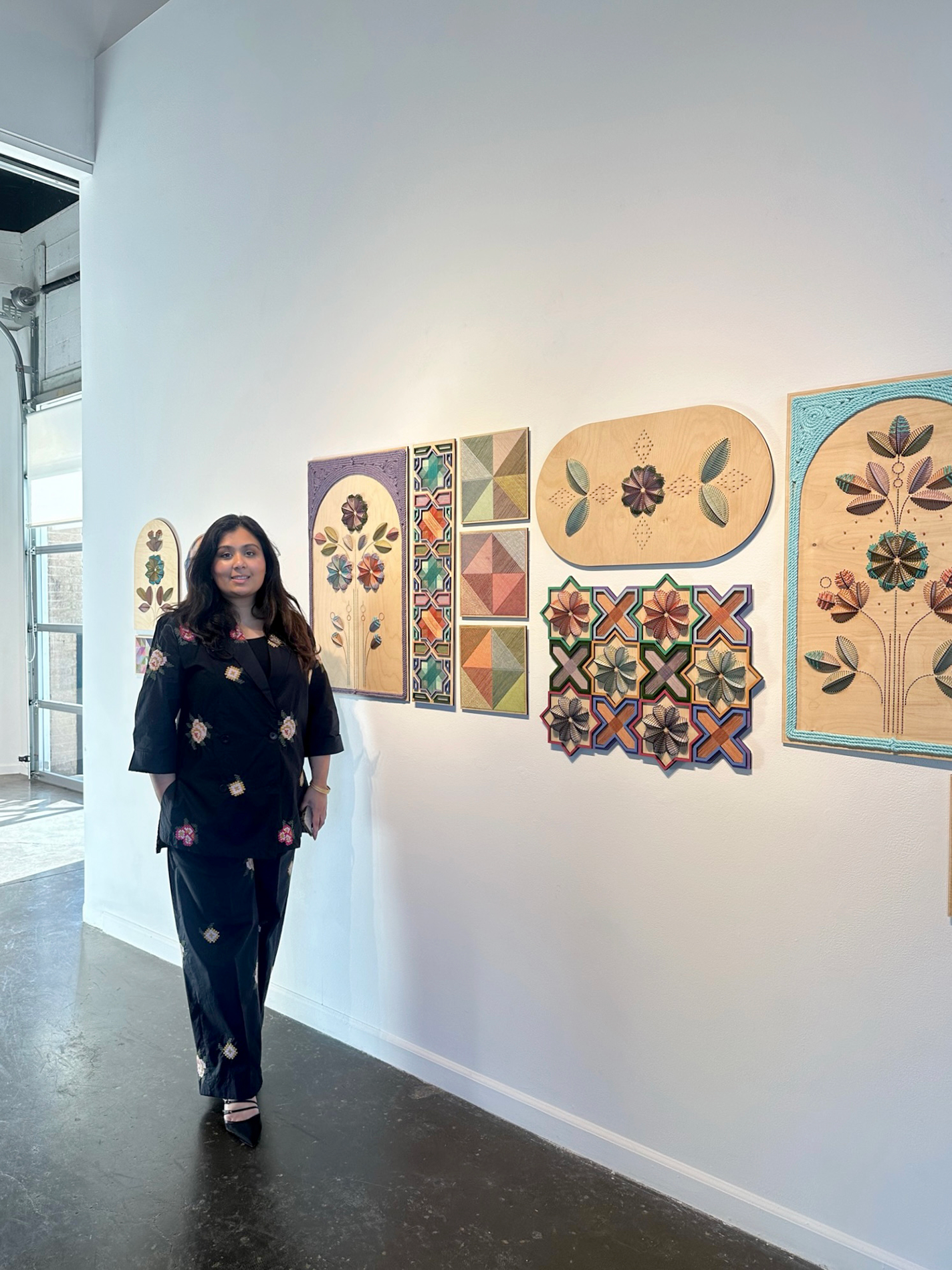 My practice centers on embroidering through wood that integrates beadwork, layering patterns, and dimensional botanicals. Inspired by Pakistani textiles, Islamic geometry, and architectural relief and fresco work, I reinterpret tradition in contemporary forms.