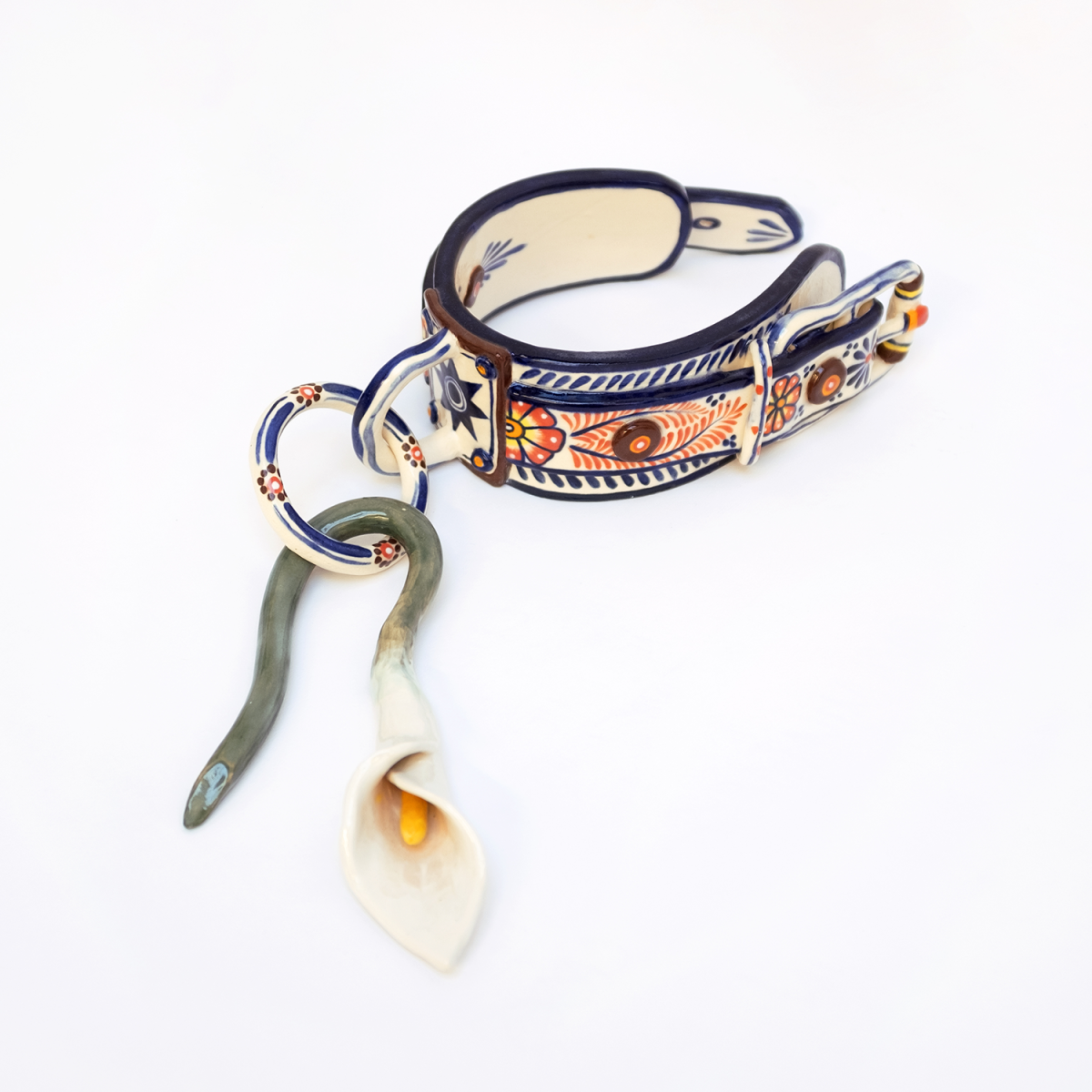 Brooklyn-based Santibañez is best known as a tattoo artist specializing in black-and-gray Chicano tattooing, but their multidisciplinary art practice encompasses ceramics, painting, drawing, installation, leatherwork, and oral history, in which they hold a master’s degree. Born and raised in Georgia to a Mexican mother and white American father, Santibañez found punk as a teenager. Their art is steeped in Chicano symbolism and punk aesthetics: they adorn ceramic belts and pyramid studs with flowers, patterns from Talavera tiles, and bandanas. Santibañez is also a leading thinker in the body modification industry and has presented workshops on trauma-informed tattooing and social justice. Afterlife Press, a tattooing-focused publisher based in New Mexico, published their book Could This Be Magic? Tattooing as Liberation Work in 2020. They currently tattoo at a private studio called Flower World in Brooklyn. Read about their morning ritual, which is centered around a green Oaxacan vela de concha (shell candle) given to them by a tattoo client, in “Morning Practice” in the Spring 2024 issue of American Craft.