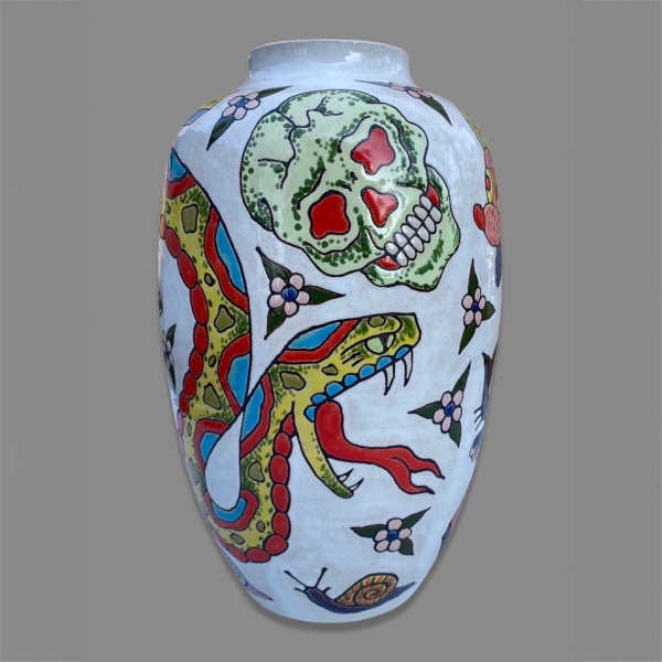 My work is interdisciplinary and spans oral history and writing, tattooing, oil painting, ceramics, and leather tooling. I find that ideas and images can have many lives across different forms, and I love to translate them back and forth to see how they maintain or lose their potency.