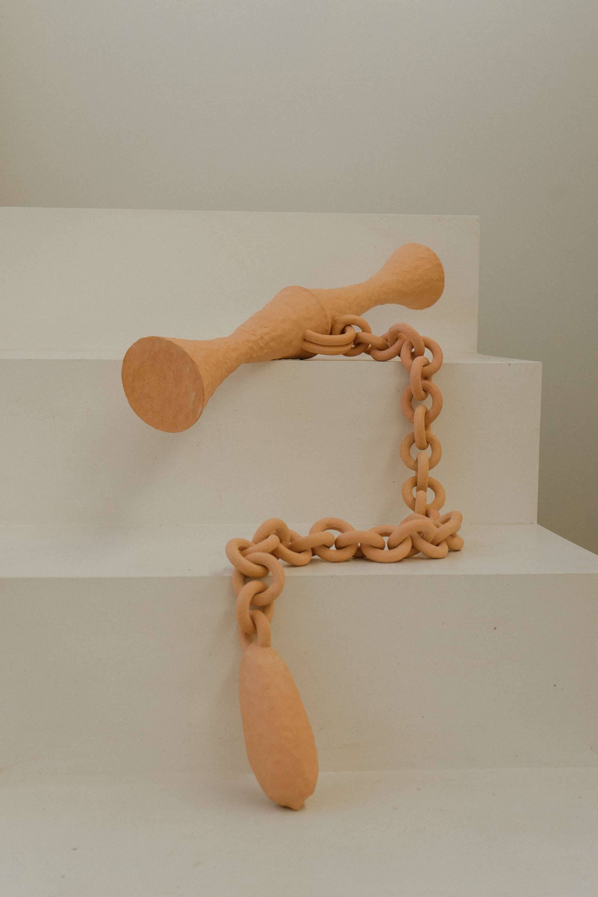Sharpe’s stoneware vessels strike an imposing figure. Her vases, dimpled with fingerprints and gritty in texture, are bedecked with heavy ceramic chains, which can be used to hang the vessel or as decoration. When lit, her tiered sculptural candelabras cast intriguing shadows across a room. The Oakland, California–based ceramist, who has been working under the name the Latch Key Ceramics since 2014, has been drawn to objects her whole life. “My earliest memories are of investigating objects: tapered candles and their holders, lace doilies, antique porcelain dolls, an oil painting of two girls lounging in Victorian dress, and the house my father built,” says Sharpe. In 2017, she cofounded Standard Parts Studios, an interdisciplinary community studio in Oakland, where she makes all her work. Shivaun Watchorn wrote about her lace candelabra, made with ritual in mind, in “Light My Fire” in the Spring 2024 issue of American Craft.