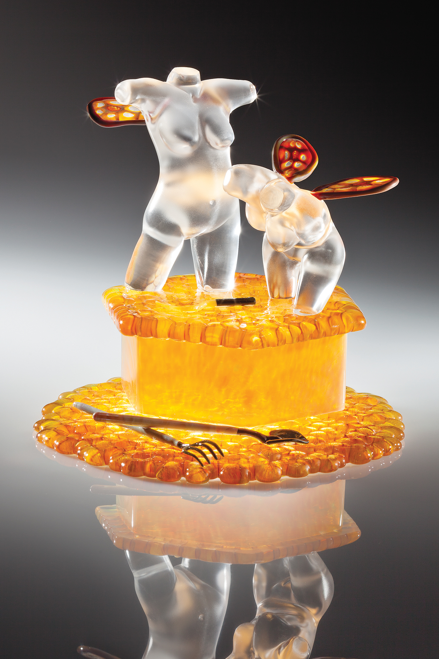 My work is made using a combination of glassmaking skills that include glassblowing, hot-sculpting, and flame work. Glass has special properties that are unlike those in any other material: Its three-dimensional light, and the way it moves when molten, helps me define my imagery. I explore pollinator themes, figurative narratives, and abstracted themes of time and movement. Lately, I am focused on our interdependence with the natural world, finding balance, and the vulnerability of all species.