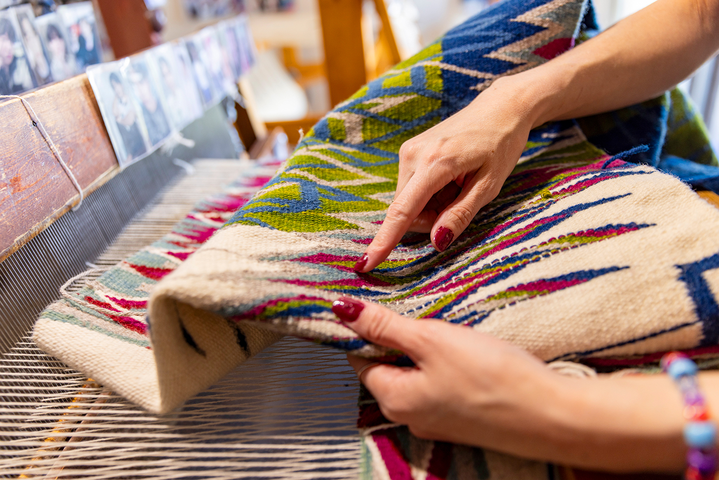 Eighth-generation weaver Emily Trujillo hangs a tapestry at Centinela Traditional Arts, her family’s gallery in Chimayo, New Mexico.