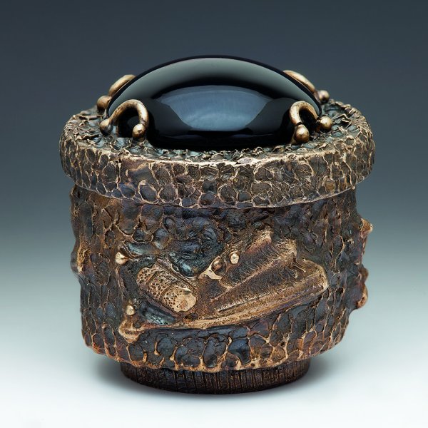 The vessels are ornamented bronze, finished with basketry details: coils and weaving in natural materials like sweetgrass, seagrass, bamboo, and grapevine. Their shapes evoke Japanese pottery and basketry, and they’re sometimes embellished with precious metals and stones and images from the Japanese seasons.