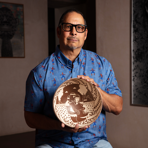 Cochiti Pueblo, (b. 1964) “Ambivalent views toward Indian culture made me strong in the belief that my art was both Indian and contemporary art and it was going to stay that way.” —Diego Romero Firmly positioning his work within an Indigenous visuality, Diego Romero has built a career constructing ceramic vessels that elevate Pueblo life to Olympian stature. A third generation professional artist, Romero was born and raised in Berkeley, California to a Cochiti father and a non-Native ...