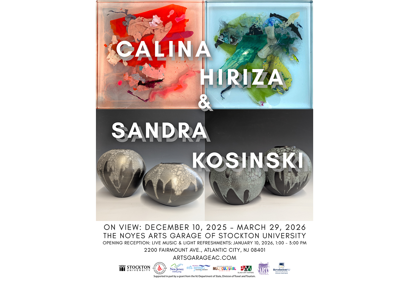This two-person exhibition showcases the work of Calina Hiriza, a Romanian American abstract artist working in resin and acrylic, and Sandra Kosinski, a New Jersey–based ceramist.