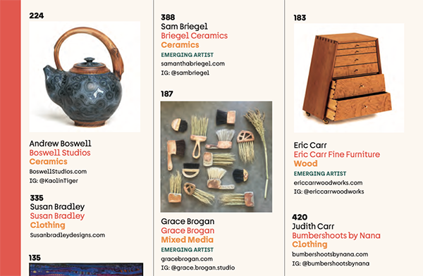 Engage with a variety of artists for unique talks and demonstrations including doll-making on Friday with Francine Haskins, textiles with James Y. Brown on Sunday, and an interview Saturday with woodworker Adiante Franszoon in booth 393.