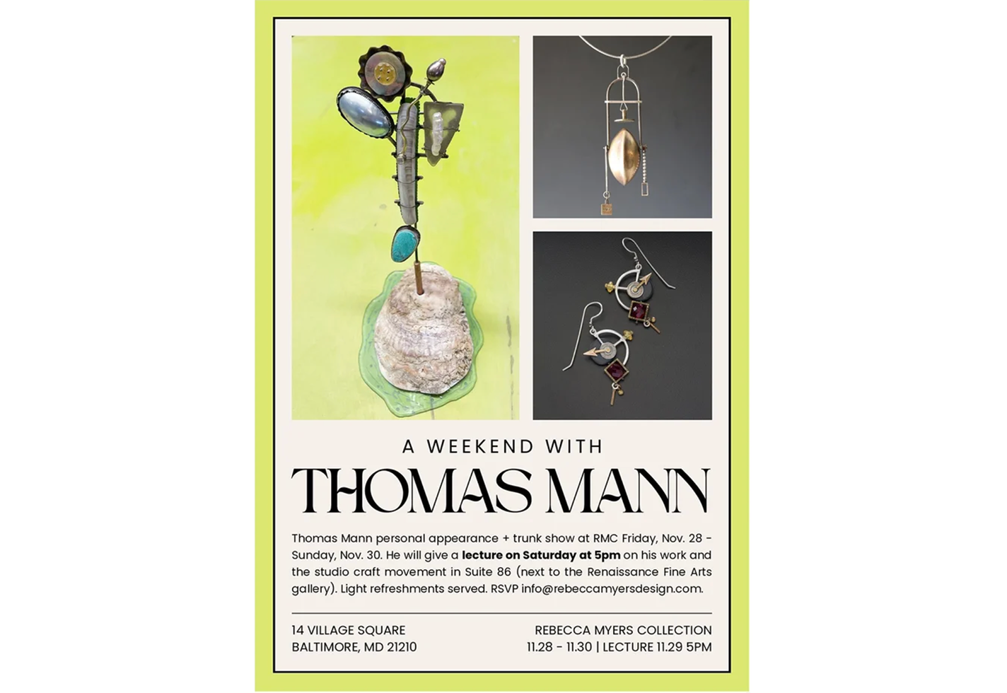 Jewelry artist Thomas Mann will make a personal appearance and hold a trunk show at Rebecca Myers Collection. He will give a lecture on Saturday, November 29, at 5 pm on his work and the studio craft movement in Suite 86 next to the Renaissance Fine Arts Gallery. Light refreshments served. RSVP at [email protected].
