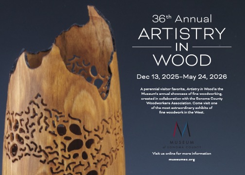 The 36th annual Artistry in Wood exhibition, presented by the Sonoma County Woodworkers Association, will open December 13 at the Museum of Sonoma County. One of the premiere woodworking shows in North America, it will feature unique furniture, turnery, boxes, lamps, sculptures, and a variety of other art works.