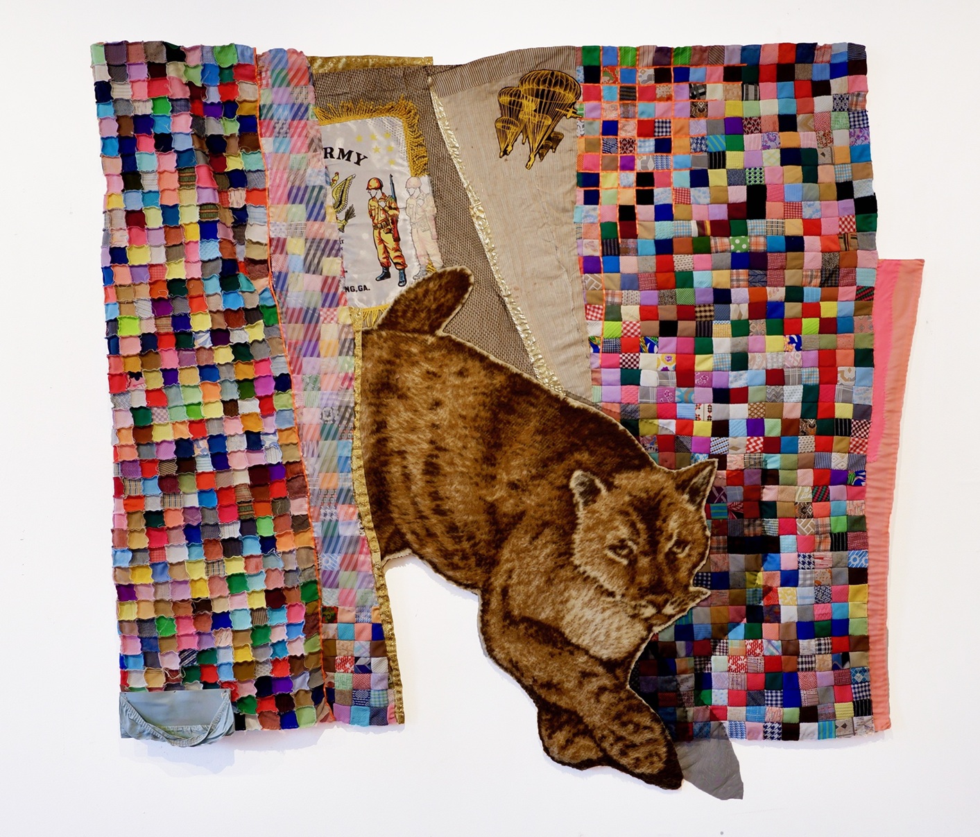Featuring over 40 works from five series created since 2020, this exhibition reveals the evolution of Fussell’s practice from traditional quilting formats to increasingly sculptural, mixed-media works incorporating upholstery techniques, photography, and digital projection. Fussell uses quilting techniques to collage together materials donated by friends, family, neighbors, and strangers in her rural town of Water Valley, Mississippi. Primarily textiles, these materials range from bed linens and used clothing to bric-a-brac and discarded objects. Fussell’s newest series integrates these materials with an archive of cellphone video stills and photographs taken by family members, creating works that, as she said, “compare global conflicts, both historical and current, with interpersonal psychodramas.”