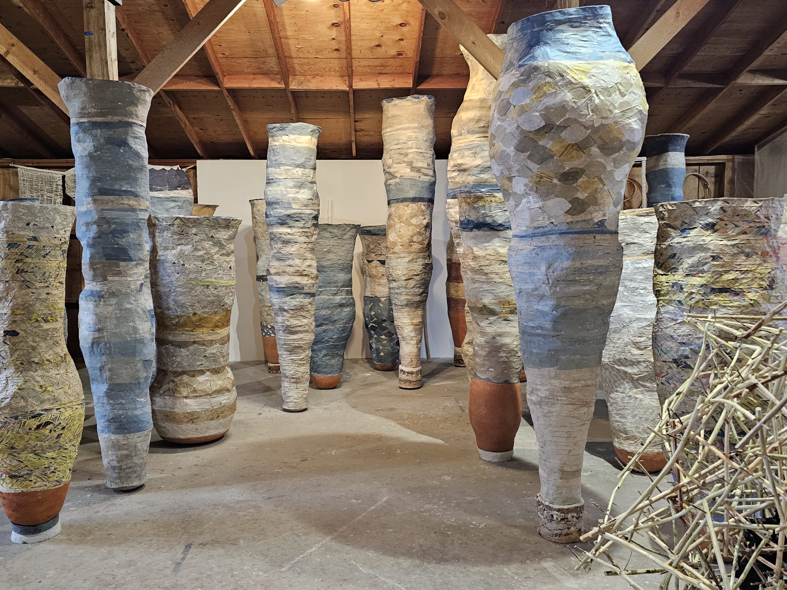 For the exhibition, diverse materials from the region such as beet pulp, blue jeans, creek willow, and regional clay are carefully collected and transformed by Hutchinson for artmaking. Much of the organic and fibrous content is boiled, pulped, and poured into large sheets of paper; the paper sheets are further cut, coated in clay, and coiled to build up the vessel forms. In addition to sculpture, printmaking serves as a medium through which Hutchinson expresses her concept of place.