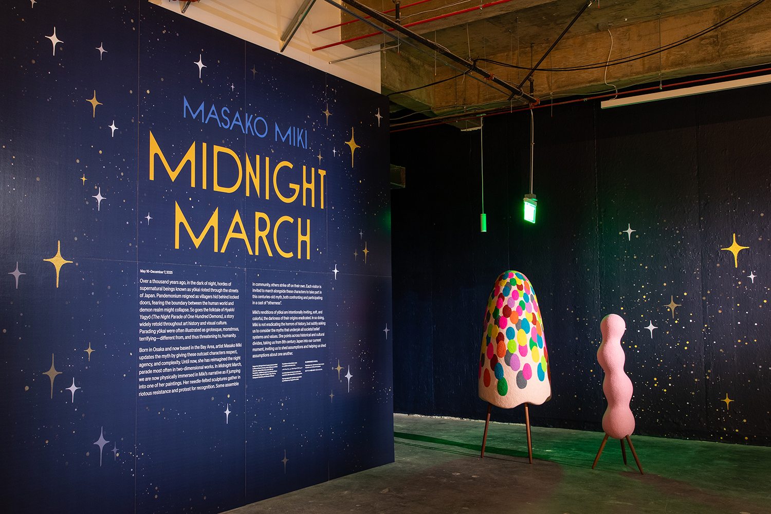 Masako Miki: Midnight March is an experiential world populated by semi-abstracted felted wool sculptures set within a galaxy. Referencing nature, Japanese yōkai (supernatural beings), and Shintoism, Miki creates new mythologies that reflect the complexity of multicultural identities and worlds. Miki’s practice is rooted in the belief that art can generate new, inclusive narratives to counter harmful lore. The artist seeks to bridge cultural divides and foster shared understanding.