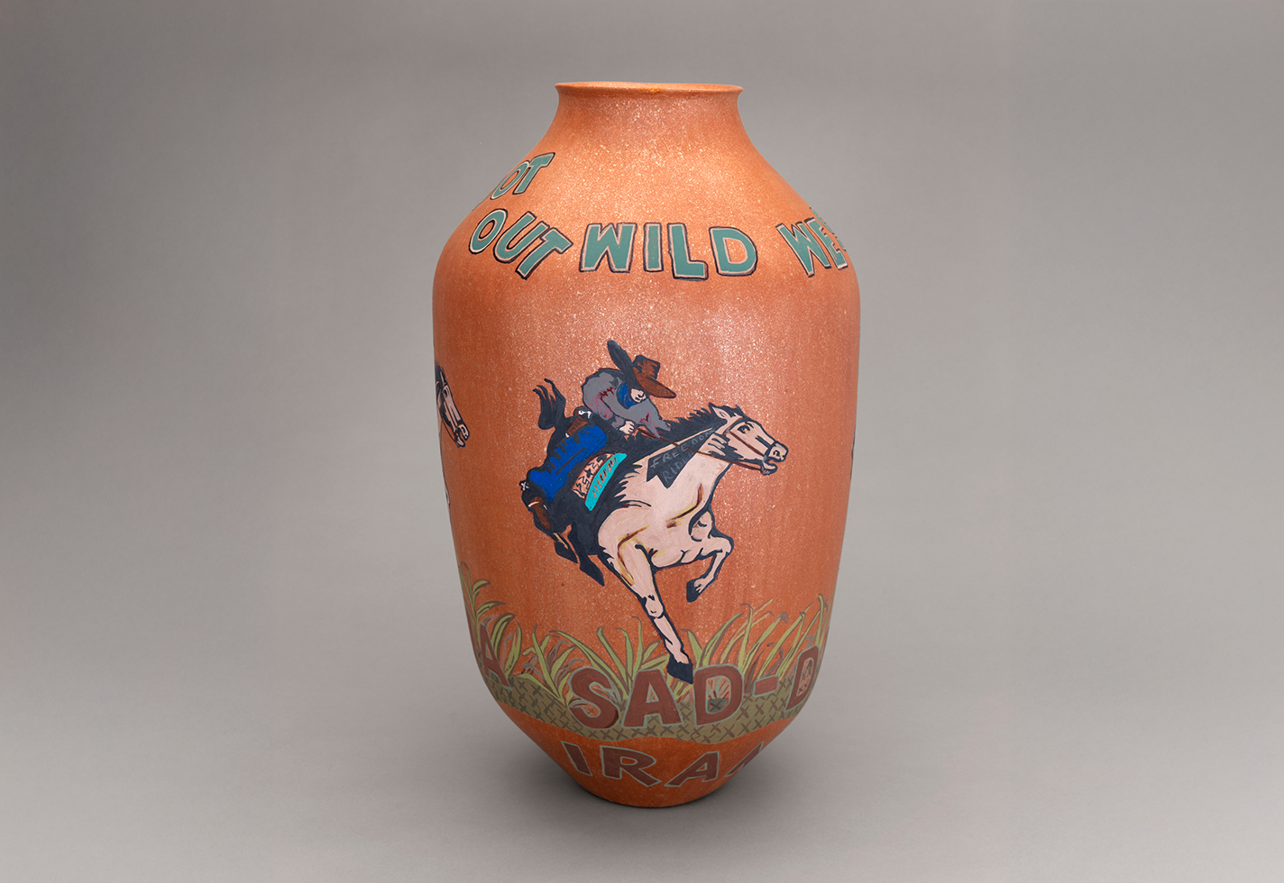 Jody Folwell’s 21.5-by-14-inch clay vessel Wild West Show will be on display in O’Powa O’Meng, her first solo exhibition.