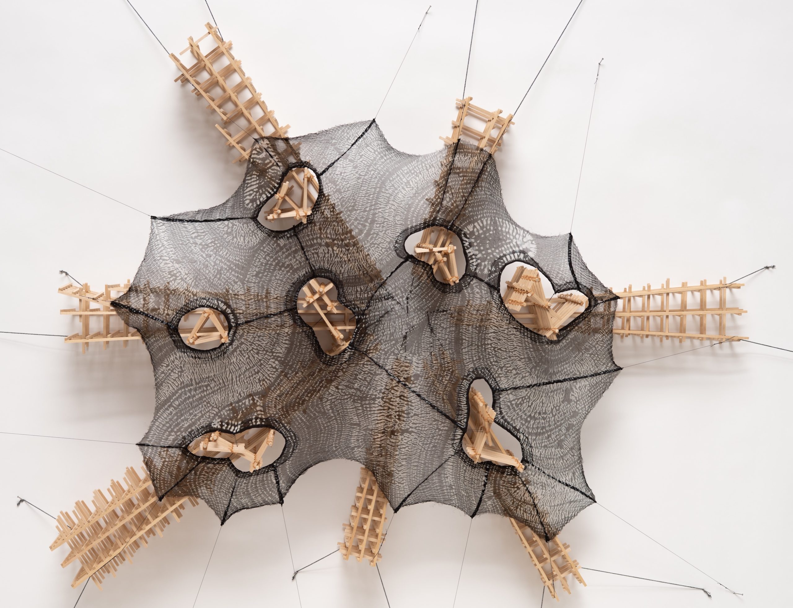 Mo Kelman’s sculptural artworks are driven by contrasts and interactions between the built environment and the natural world, merging abstracted images of water in its various forms—rivers, lakes, clouds and ice—with industrial and architectural structures. Kelman favors simple, malleable materials such as wood, wire and bamboo and uses geometric logic to invent efficient construction methods. Onto these structures she integrate “skins” by crafting nets or by resist-dyeing white silk organza into elastic, translucent, woodgrain-patterned membranes. Many of the sculptures are tensile structures where the pliable membranes are tethered, stretched, and shaped through tension.