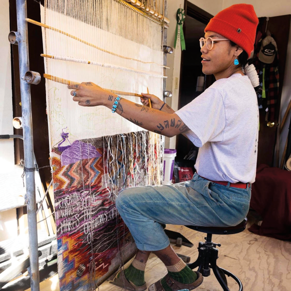 Brie Ruais works fast, separating a hunk of clay that weighs as much as she does into slashes and craters, decorating it with handprints and smudges. Then, standing in the middle of it all, she spins herself around, drizzling glaze onto the fragile, creviced clay fragments. Her gestures—the forces of her body—are evident in all that she creates, including Circling Inward and Outward, 128 lbs (2020, glazed and pigmented stoneware, rocks, and hardware, 96 x 92 x 3 in.), pictured here. It took about 15 minutes to make. “I’m connecting with the feeling body as opposed to the thinking body,” says Ruais, who lived and worked in New York City for over two decades and is now based in Santa Fe. “I return to the physical body and let it guide my movements.”